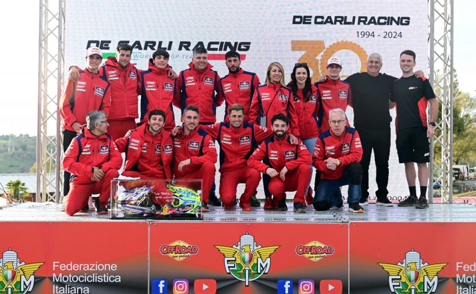 Gisteren vierde het De Carli-team haar dertigste jaar in het wereldkampioenschap motorcross. Hierbij waren veel toprijders aanwezig die er voor gezorgd hebben dat het team een hoofdrol heeft vervult in de Italiaanse sport. Het feest vond plaats op de crossbaan van Malagrotta in Italië!