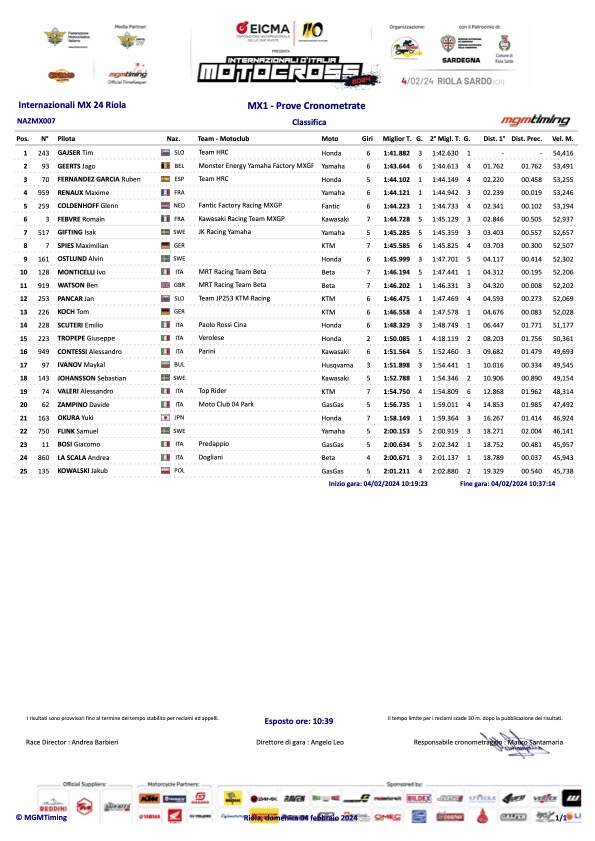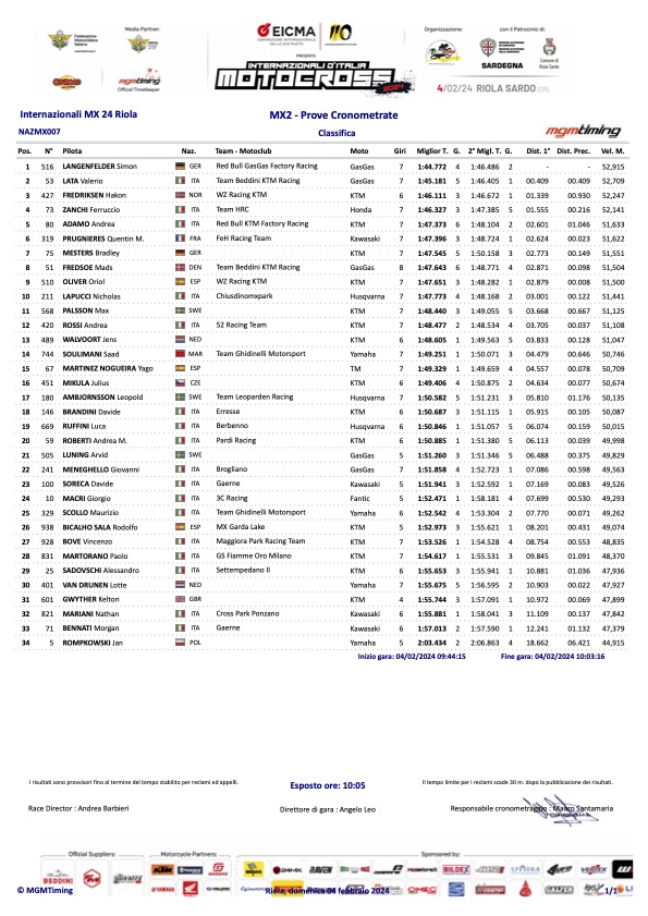 De tijdtraining van de eerste wedstrijd om het Italiaans Kampioenschap in Riola Sardo zitten erop. In de 125 klasse wist de Nederlander Gyan Doensen de snelste tijd neer te zetten. Simon Laengenfelder was snel in de MX2 klasse en Tim Gajser pakte de pole position in de MX1 klasse. Bekijk hieronder alle tijden: