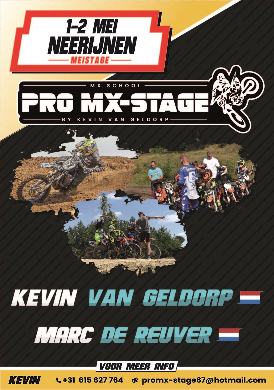 Hallo allemaal, op 1 & 2 Mei organiseert Pro mx-stage een Meivakantie stage te Neerijnen.