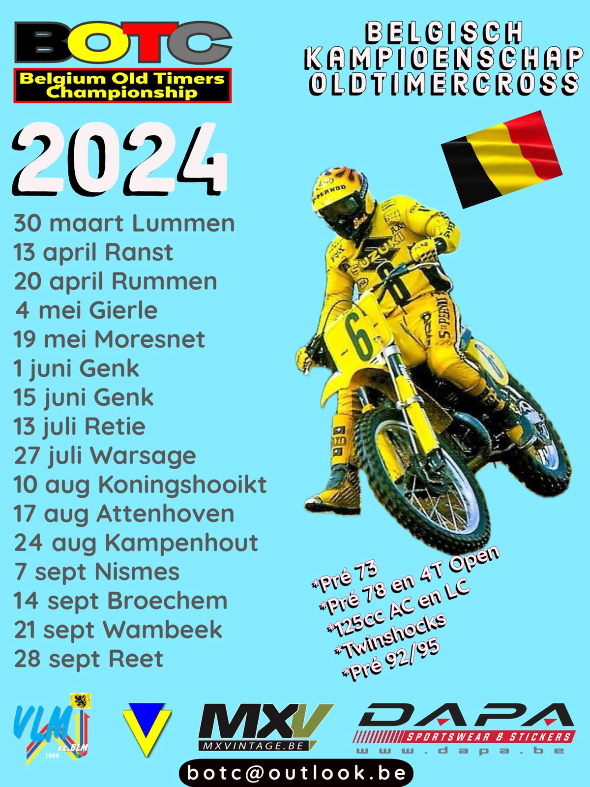 Buiten het feit dat er te elfder ure altijd wat kan wijzigen presenteren wij jullie met fierheid de kalender van het Belgisch kampioenschap oldtimercross. Het is bovendien een ietwat speciale jaargang want de BOTC blaast 20 kaarsjes uit in 2024.