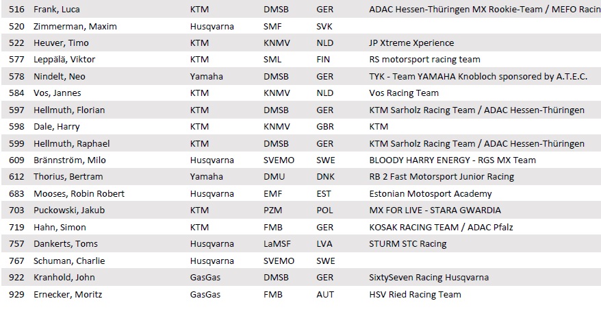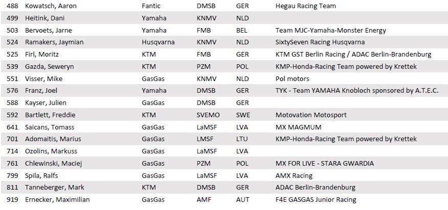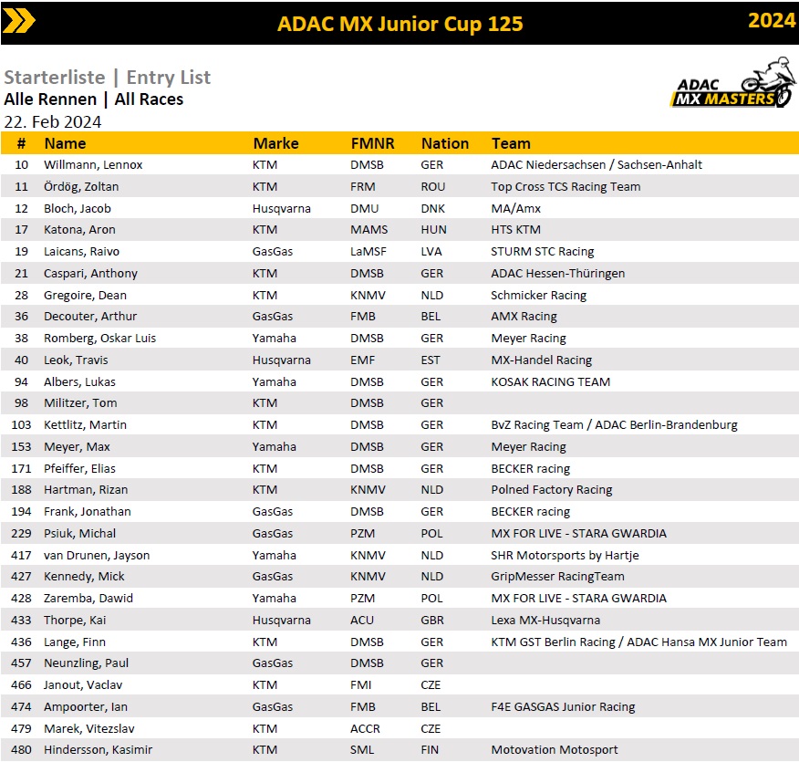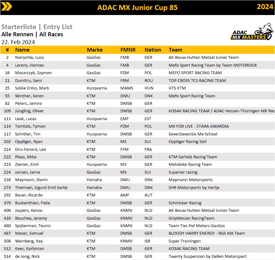 De ADAC heeft vandaag de deelnemerslijsten voor de ADAC 85 en 125 Cup bekend gemaakt. Op deze lijsten staan ook verschillende Nederlanders. De lijsten van de ADAC Youngster 250 Cup en de Masters klasse zijn momenteel nog niet vrijgegeven.