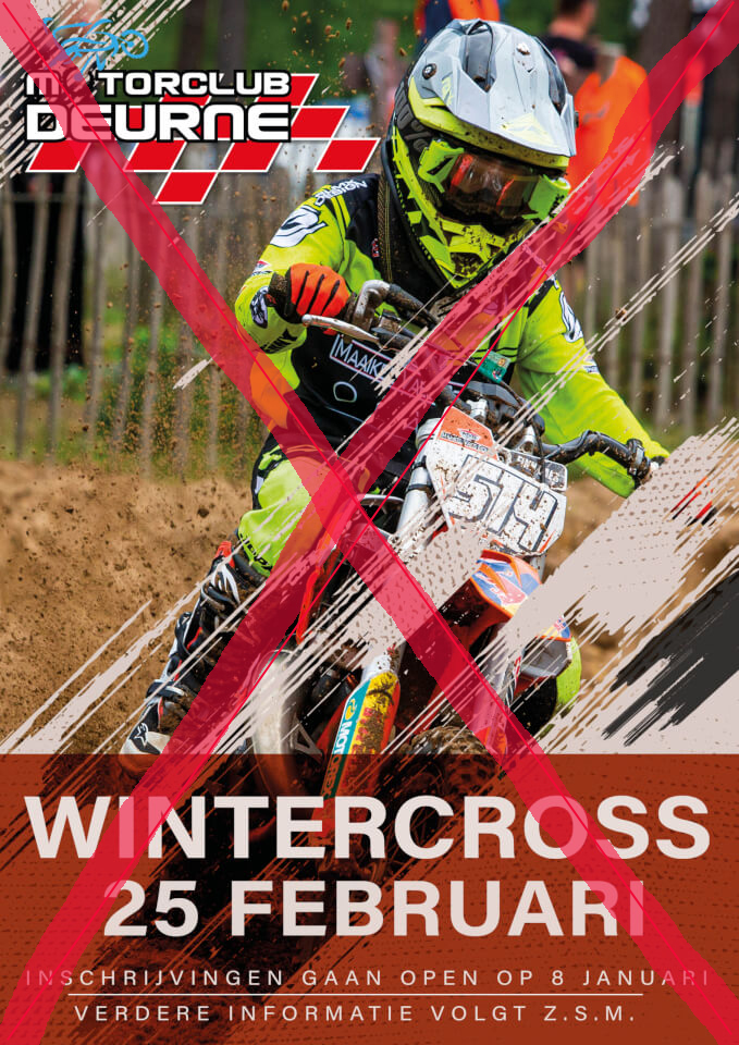 Met grote spijt moeten wij jullie informeren dat de Wintercross van MC Deurne helaas afgelast moet worden vanwege de extreme regenval van de afgelopen dagen en wat er nog verwacht wordt. Het spijt ons ten zeerste dat we dit moeten meedelen.
