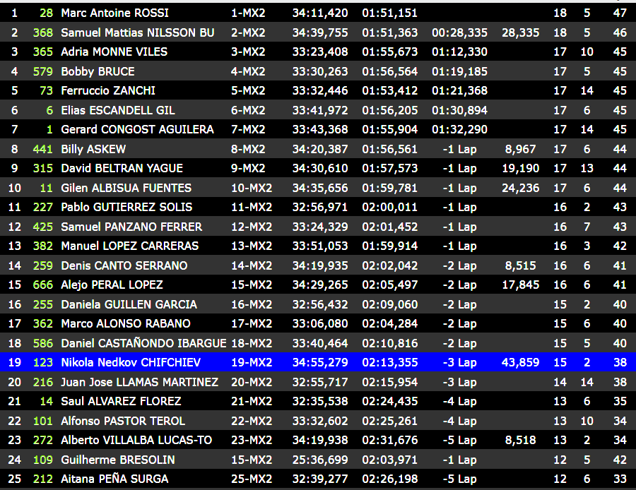 De tweede manche van de MX2 klasse werd opnieuw gedomineerd door Marc Antoine Rossi. De rijder van het GasGas Factory team bleef hierbij Samuel Nilsson en Adria Monne.