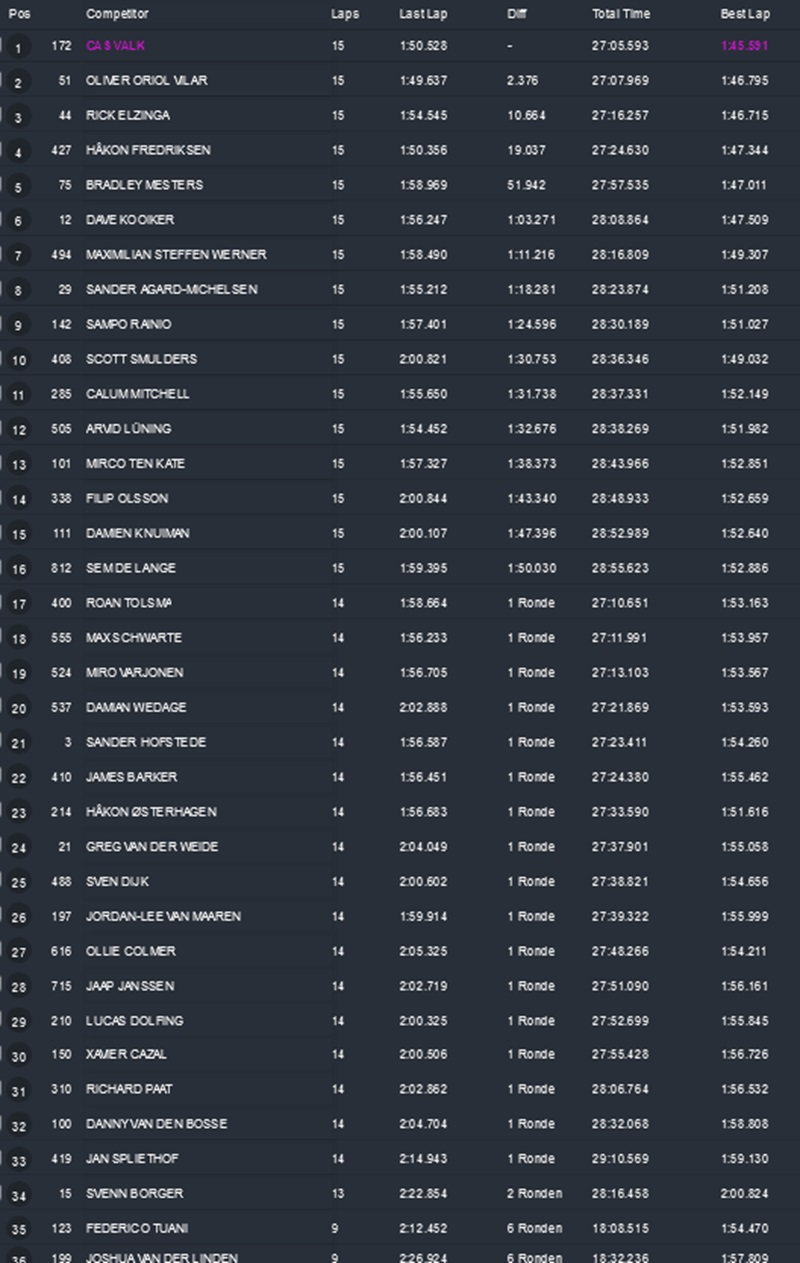 Klik op de volgende link voor alle uitslagen: https://speedhive.mylaps.com/livetiming/97C6C9B243ECB3E3-2147483679