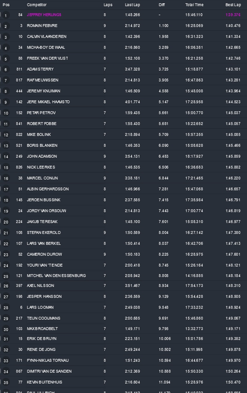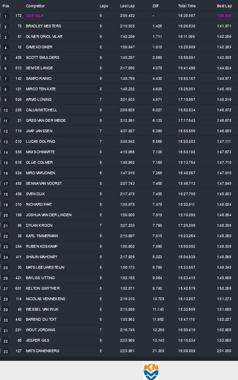 Klik op de volgende link voor alle uitslagen: https://speedhive.mylaps.com/livetiming/97C6C9B243ECB3E3-2147483679
