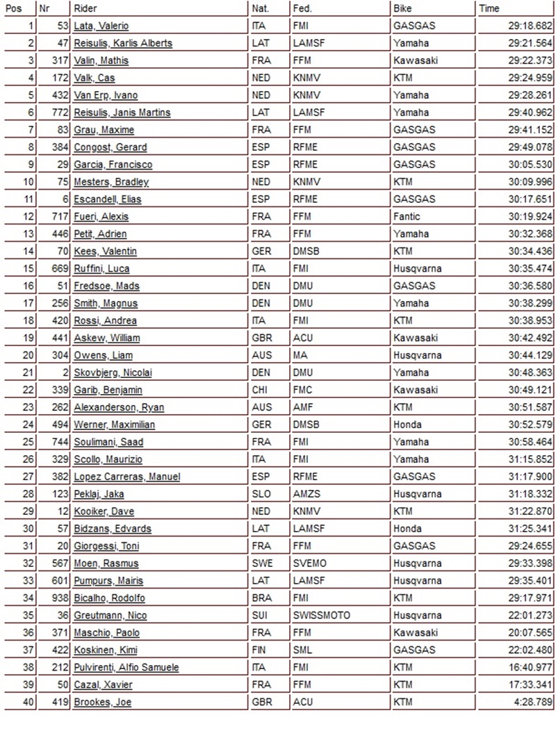Lata wint eerste manche EMX250 in Spanje, Valk 4 by motocrossplanet23 maart 2024 Valerio Lata heeft de eerste manche van de EMX250 klasse in Spanje weten te winnen. Lata won de manche voor Karlis Alberts Reisulis en Mathis Valin. Cas Valk werd na een val vierde, net voor Ivano van Erp! Eerste manche EMX250