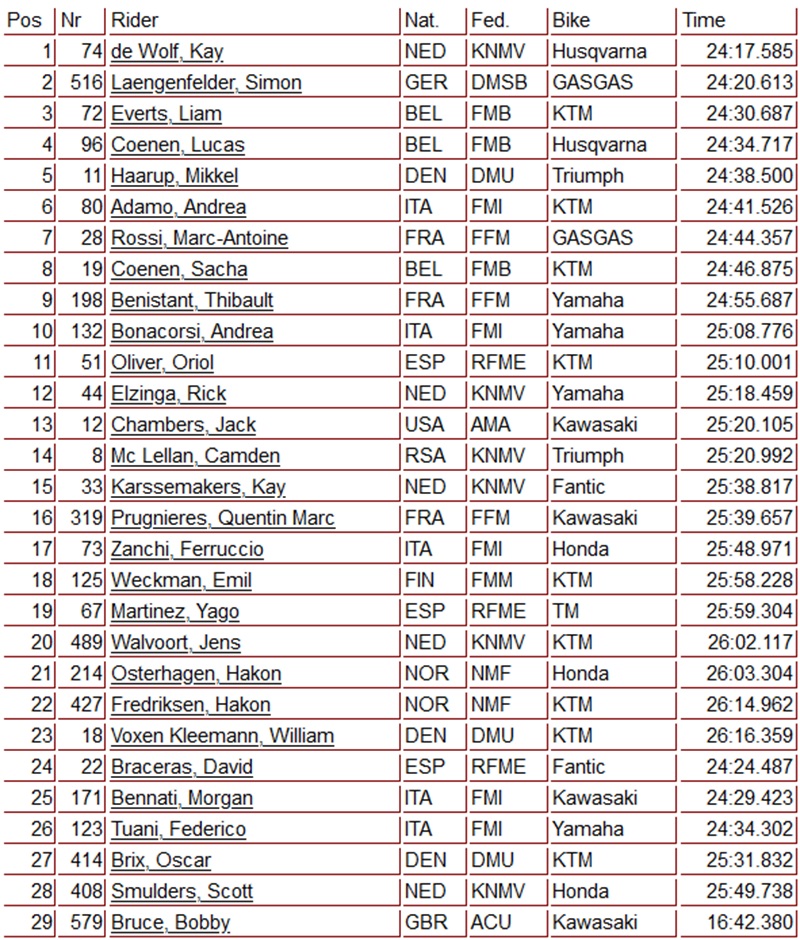 Kay de Wolf heeft op overtuigende wijze de kwalificatieheat van de MX2 klasse in Spanje weten te winnen. De Wolf nam gelijk de leiding en wist de hele wedstrijd Simon Laengenfelder op een veilige afstand te houden. Liam Everts maakte na zijn duimbreuk een sterke comeback door derde te worden voor Lucas Coenen.