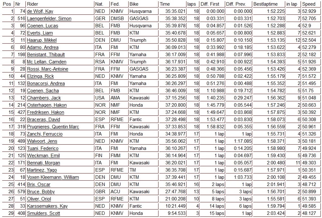 Liam Everts en Mikkel Haarup maakten de top vijf compleet. Na een goede start werd Rick Elzinga tiende, twee plaatsen voor Sacha Coenen.