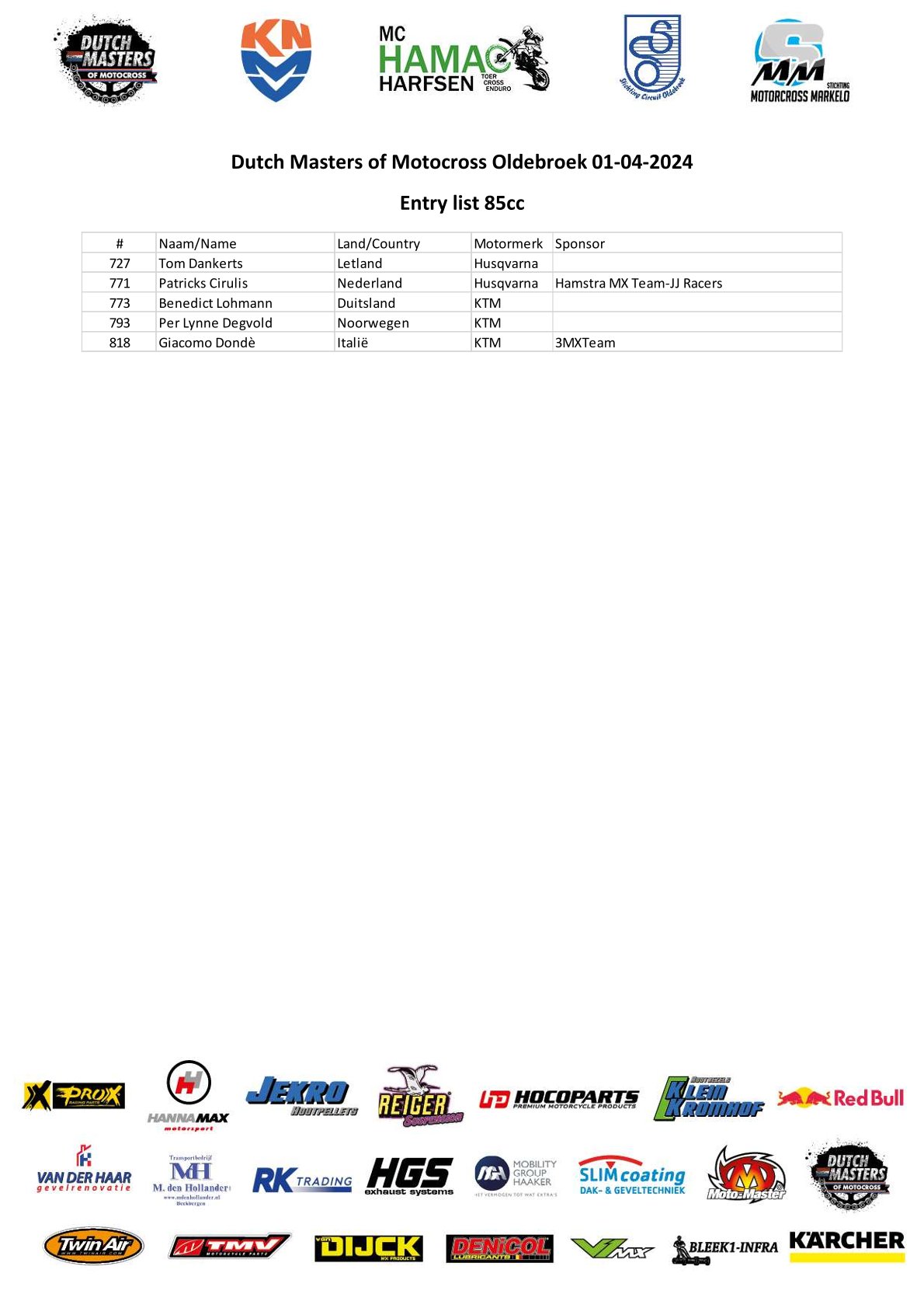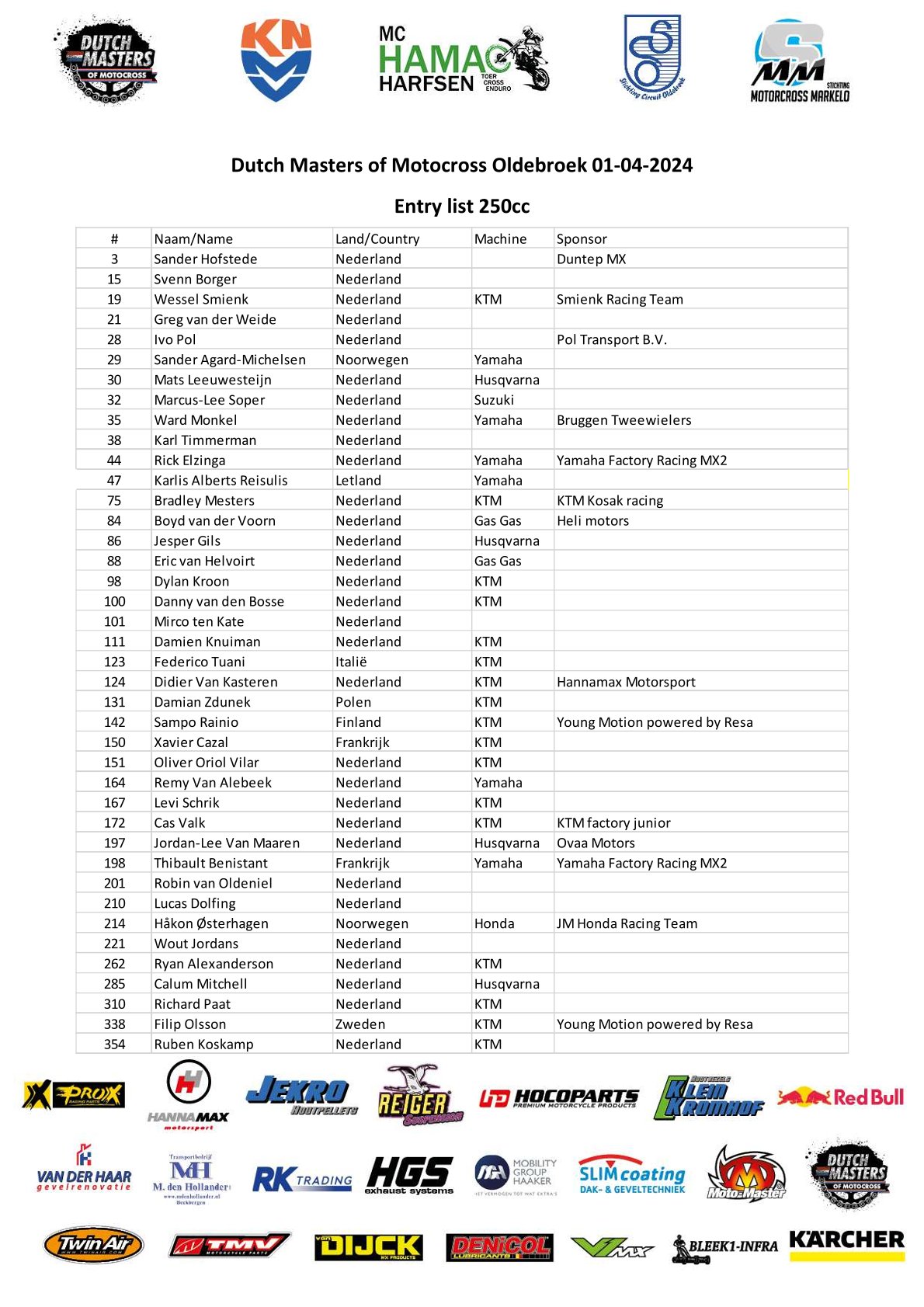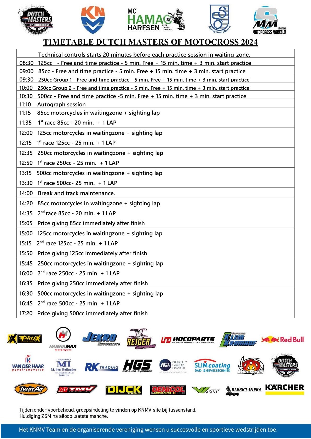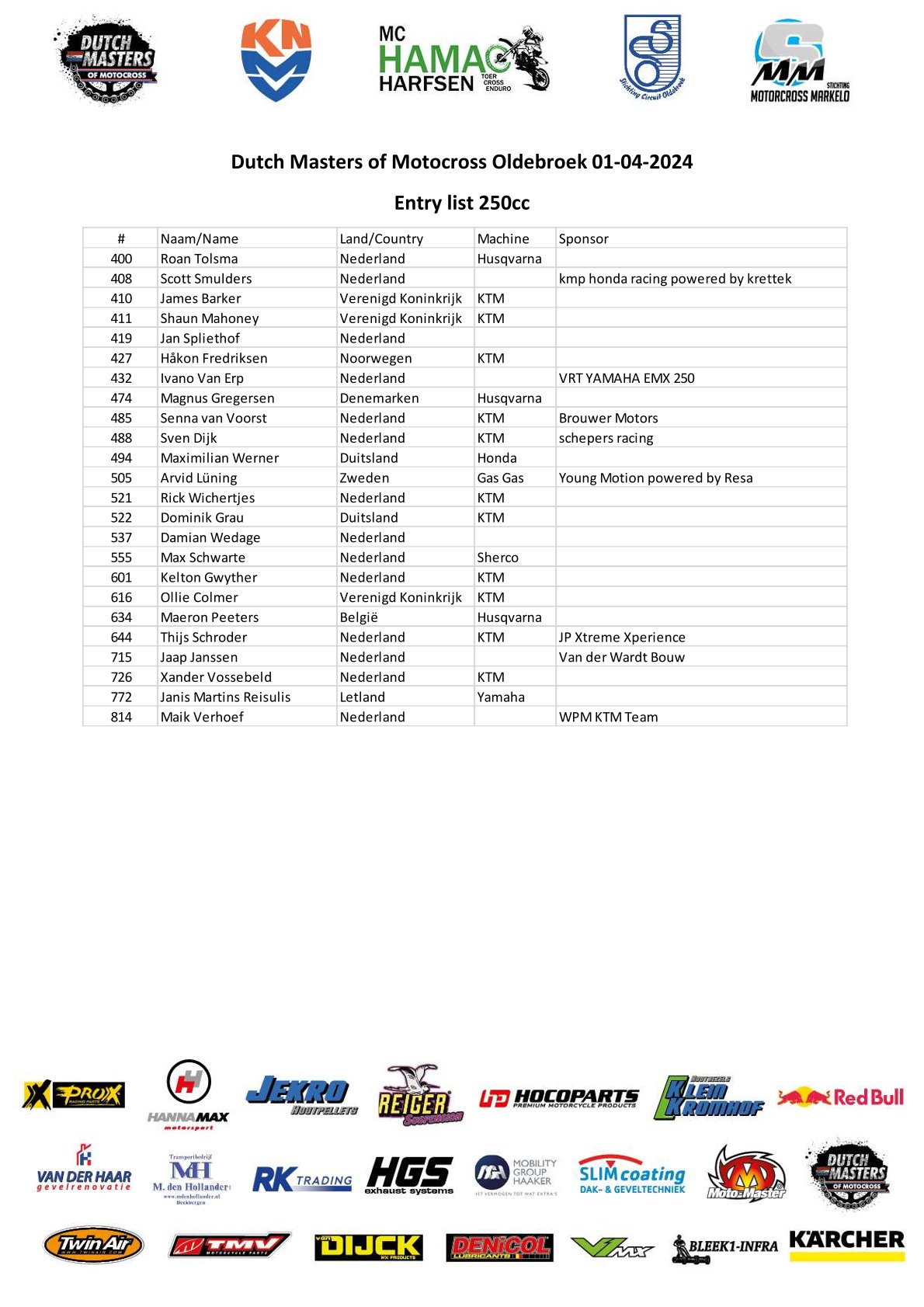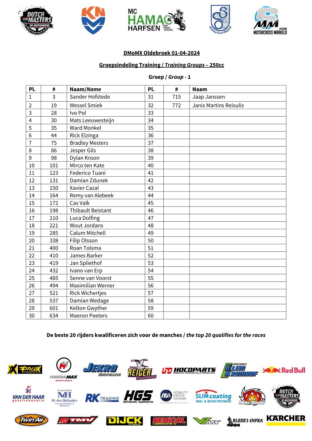 Deelnemerslijsten en tijdschema Dutch Masters Oldebroek by motocrossplanet28 maart 202430 maart 2024 Aanstaande maandag wordt de tweede wedstrijd van de Dutch Masters of Motocross verreden op het circuit van Oldebroek. Bekijk hieronder de deelnemerslijsten, 250 groepsindeling en het tijdschema!