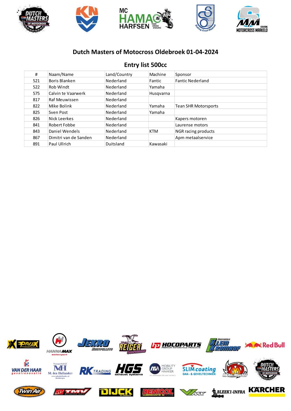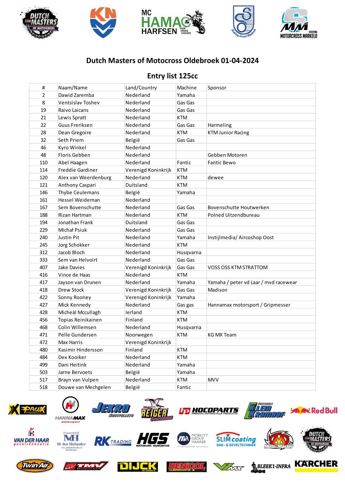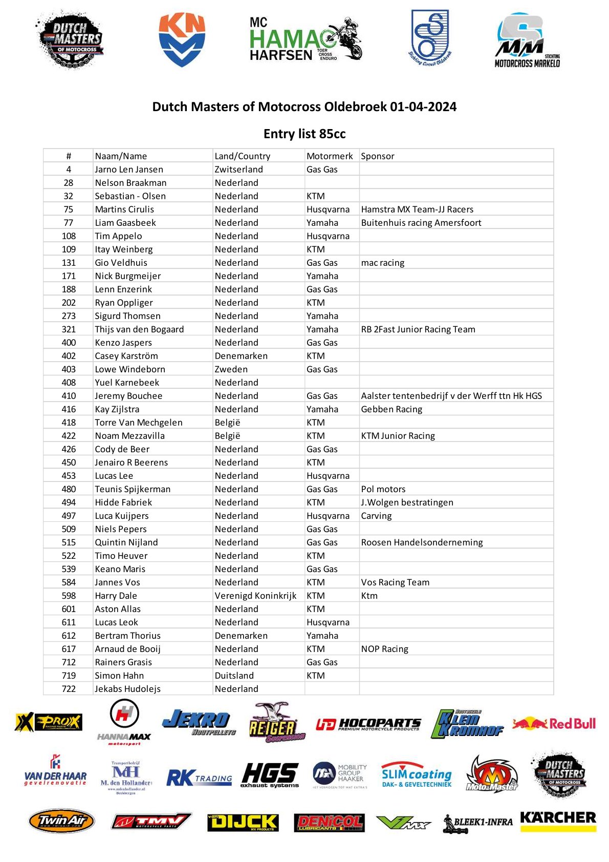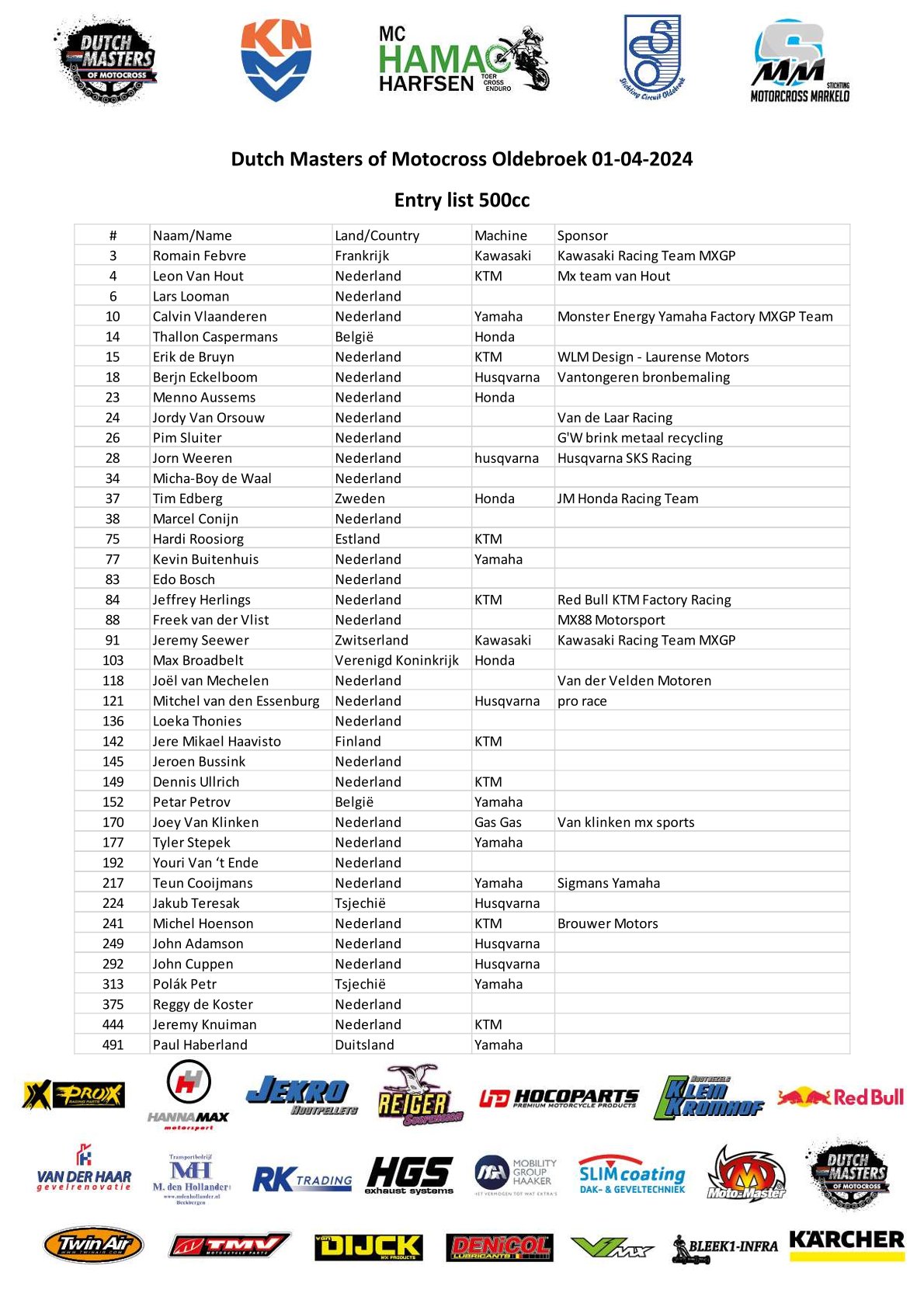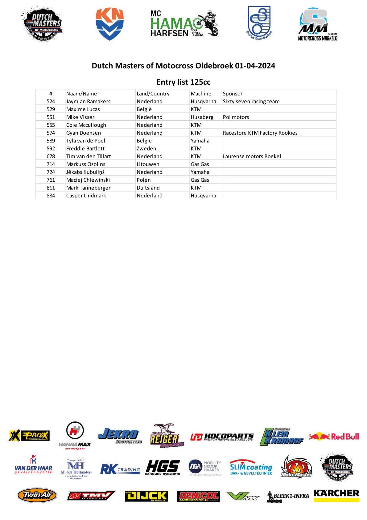 Deelnemerslijsten en tijdschema Dutch Masters Oldebroek by motocrossplanet28 maart 202430 maart 2024 Aanstaande maandag wordt de tweede wedstrijd van de Dutch Masters of Motocross verreden op het circuit van Oldebroek. Bekijk hieronder de deelnemerslijsten, 250 groepsindeling en het tijdschema!