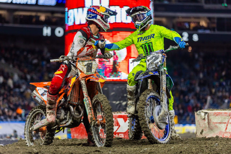 Tijdens de AMA Supercross in Seattle kregen we een titanenstrijd te zien tussen Cooper Webb en Chase Sexton om de overwinning. Webb wist uiteindelijk de wedstrijd te winnen voor Sexton en beide rijders maakten hiermee punten goed op Jett Lawrence, die aan de leiding staat in de tussenstand. Kom meer te weten over de wedstrijd in Seattle en het gevecht tussen Sexton en Webb.