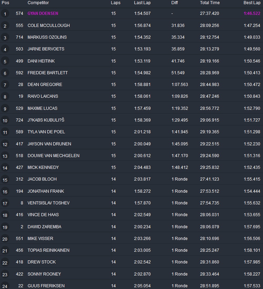Klik op de volgende link voor alle uitslagen: https://speedhive.mylaps.com/livetiming/FC2DF9159DC2E312-2147483684