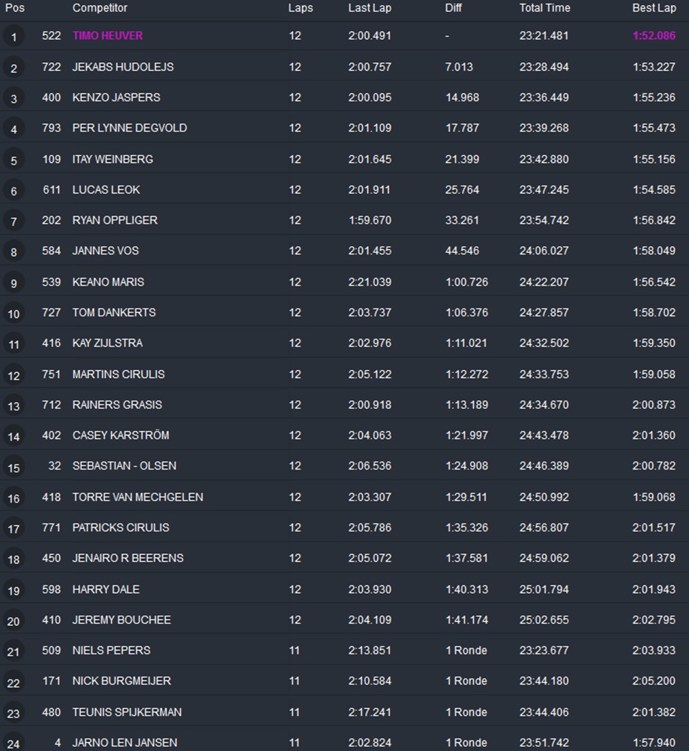 Klik op de volgende link voor alle uitslagen: https://speedhive.mylaps.com/livetiming/FC2DF9159DC2E312-2147483684