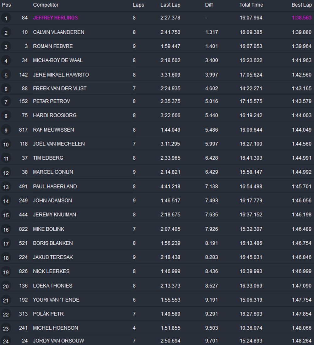 Klik op de volgende link voor alle uitslagen: https://speedhive.mylaps.com/livetiming/FC2DF9159DC2E312-2147483684