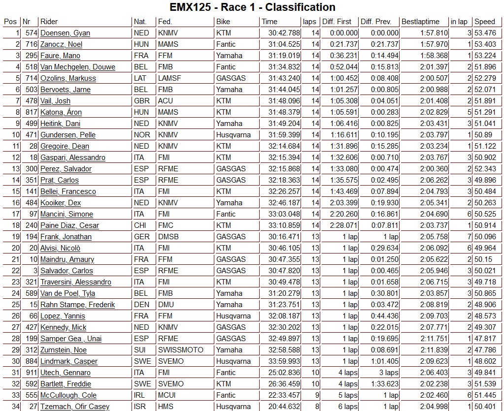 Gyan Doensen wint eerste manche EMX125 Sardinië by motocrossplanet6 april 2024 Gyan Doensen heeft na een hele sterke wedstrijd de eerste manche van het EMX125 kampioenschap in Sardinië weten te winnen. Bekijk hieronder de volledige uitslag.