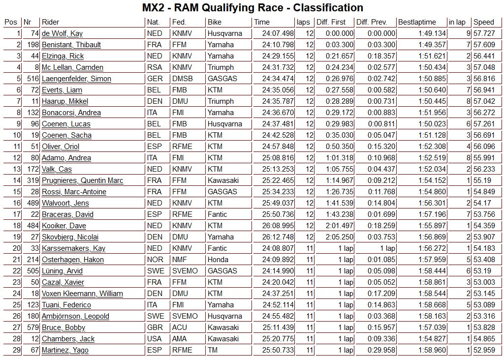 Kay de Wolf wint kwalificatieheat MX2 in Sardinie by motocrossplanet6 april 2024 Kay de Wolf heeft op sterke wijze de kwalificatieheat van de MX2 klasse in Sardinië weten te winnen. De Wolf rekende af met Rick Elzinga en Thibault Benistant en won. Benistant werd tweede voor Elzinga. Bekijk hieronder de volledige uitslag: