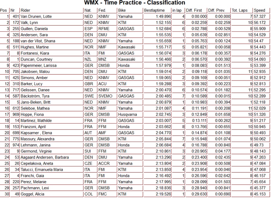 Lotte van Drunen heeft in de tijdtraining van het WK Dames in Sardinië de snelste tijd op de klok weten te zetten. Van Drunen was 2,5 sec sneller dan de tweede dame, Lynn Valk. Daniela Guillen kwam uit op een derde plaats voor Sara Andersen en Shana van der Vlist.