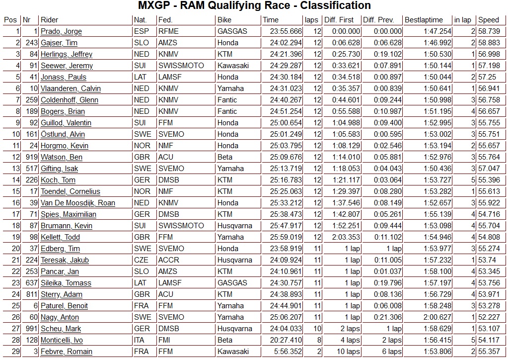 Jorge Prado heeft de kwalificatieheat van de MXGP klasse in Sardinië gedomineerd. Prado nam gelijk de kop en liep weg bij Tim Gajser. Jeffrey Herlings moest in de beginfase werk verzetten om op een derde plaats te komen en op dat moment waren de kopmannen al te ver weg. Herlings werd derde voor Jeremy Seewer en Pauls Jonass. De Nederlanders Calvin Vlaanderen, Glenn Coldenhoff en Brian Bogers werden zesde, zevende en achtste. Roan van de Moosdijk finishte op een zestiende plaats.