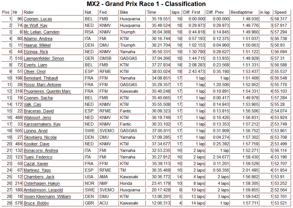 Lucas Coenen heeft op sterke wijze de eerste manche van de MX2 klasse in Sardinië weten te winnen. Sacha Coenen nam kopstart maar kreeg Kay de Wolf en Lucas Coenen in het wiel mee. Beide rijders wisten door te stoten naar de eerste en tweede plaats. De Wolf reed tot in het midden van de wedstrijd aan de leiding maar werd toen gepasseerd door Coenen. De Belg wist een gat te slaan en won de wedstrijd voor de Wolf en Camden McLellan.