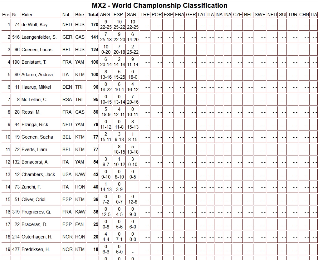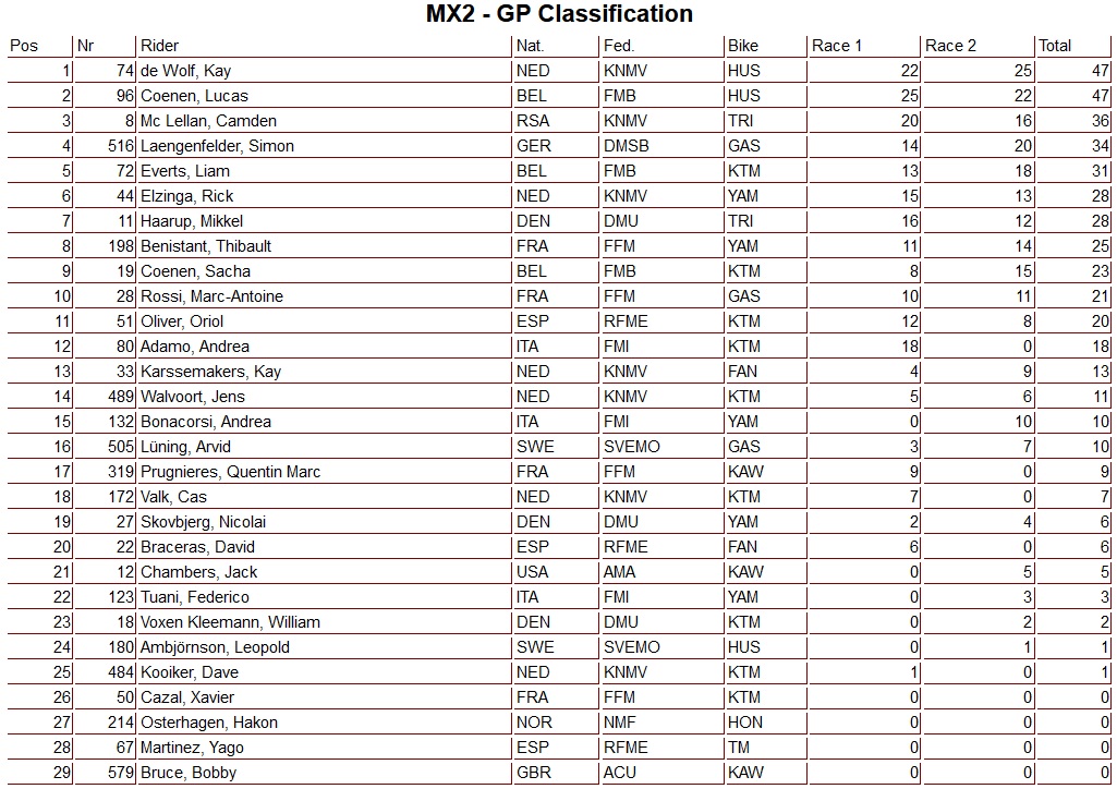 Kay de Wolf heeft met een manchezege in de tweede manche van de Grand Prix van Sardinie ook de eindzege weten te pakken. Hiermee is het zijn derde opeenvolgende zege. Lucas Coenen bedreigde de Wolf tijdens de tweede manche maar de getalenteerde Belg kwam ten val en moest genoegen nemen met een tweede plaats. Andrea Adamo werd derde voor Simon Laengenfelder en Liam Everts. Camden McLellan kwam als zesde binnen en eindigde hiermee als derde in het dagklassement.