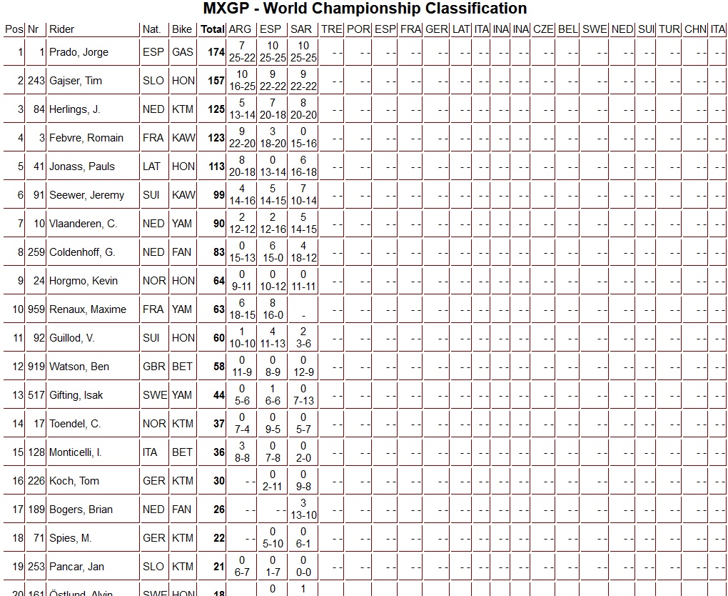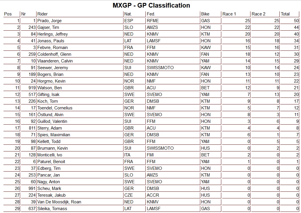 Na zijn zege in de eerste manche heeft Jorge Prado ook de tweede manche weten te winnen. Prado kreeg het niet cadeau want in de eerste helft van de wedstrijd zat Jeffrey Herlings aan zijn achterwiel. Herlings kwam echter ten val en viel terug naar een derde plaats.
