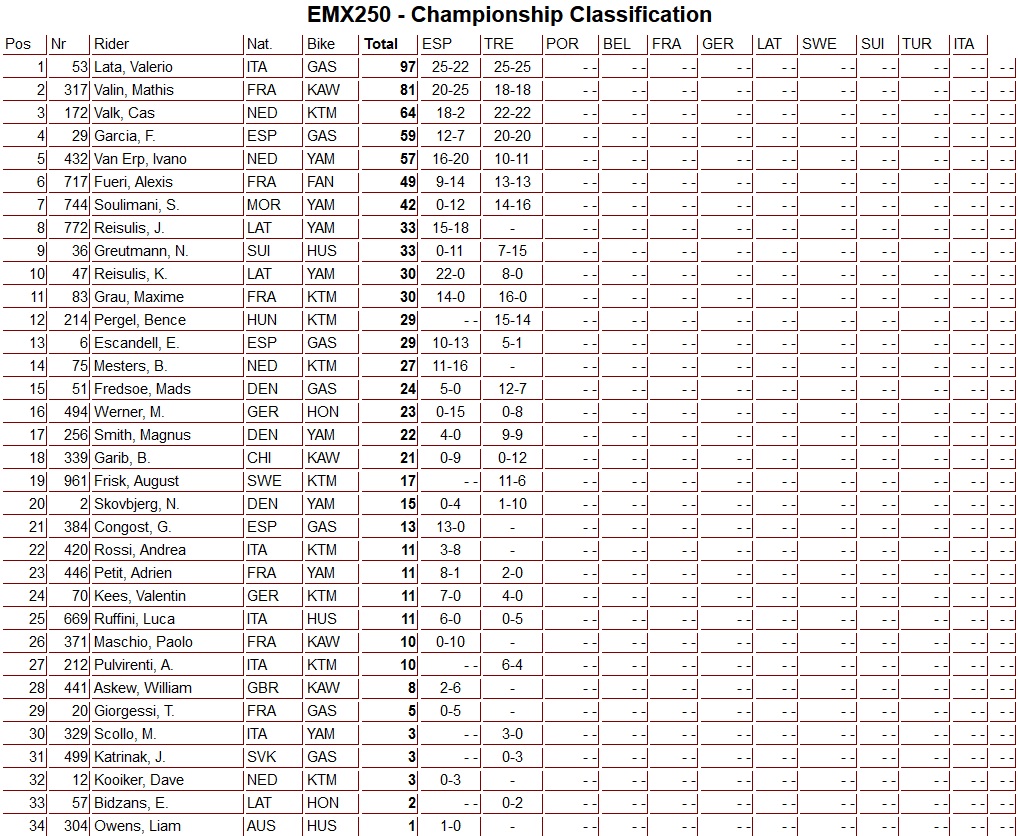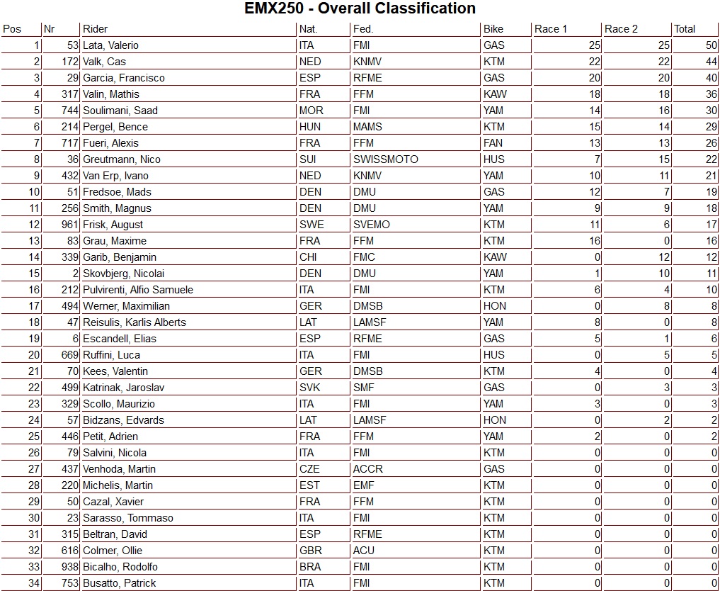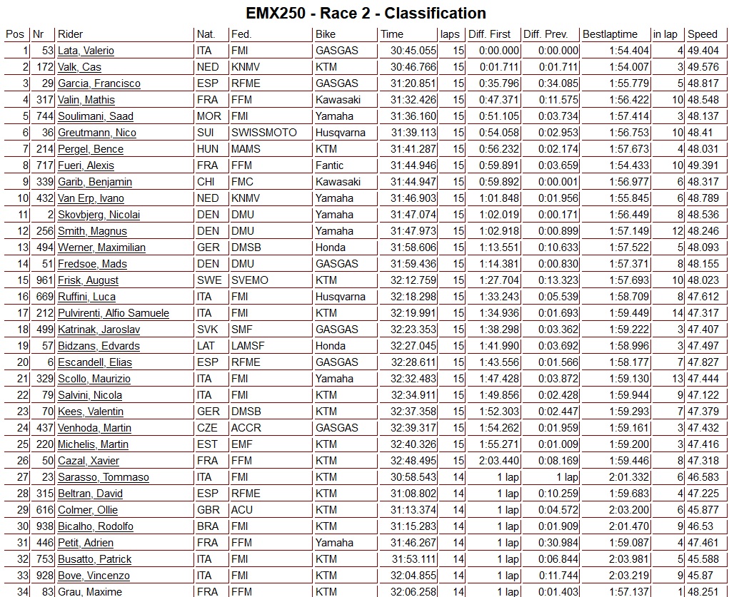 Cas Valk is in de tweede manche van de EMX250 klasse in Arco di Trento tweede geworden en is hiermee tevens tweede geworden in het dagklassement. De manchezege ging opnieuw naar de Italiaan Valerio Lata. Achter Lata en Valk werd Francisco Garcia derde voor Mathis Valin en Saad Soulimani.