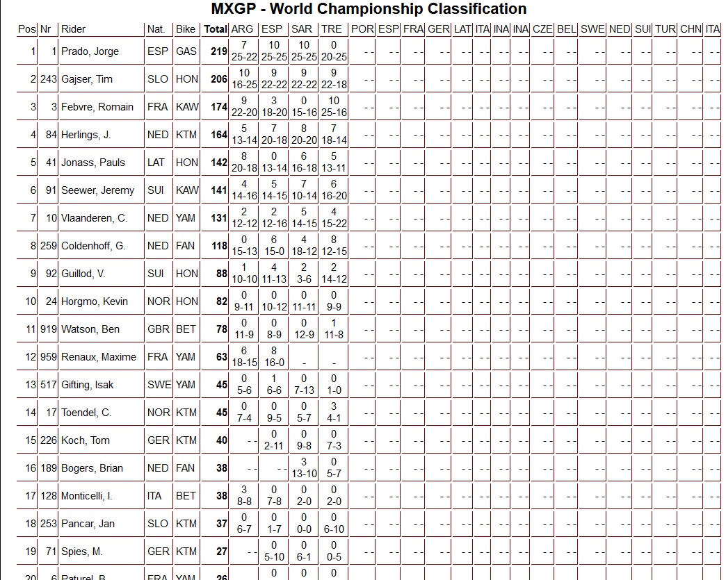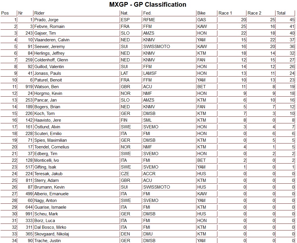 Jorge Prado heeft de tweede manche van de Grand Prix van Trentino gewonnen en dit was voldoende om zijn vierde GP zege oprij te pakken. Calvin Vlaanderen finishte op een ijzersterke tweede plaats voor Tim Gajser en Romain Febvre. Laatstgenoemde had de Grand Prix kunnen winnen maar op een tweede plaats rijdend kwam hij ten val en finishte daardoor als vijfde!