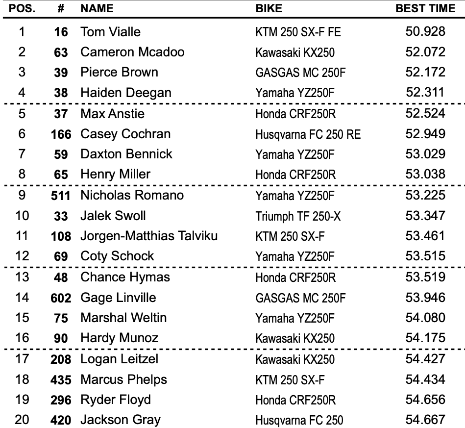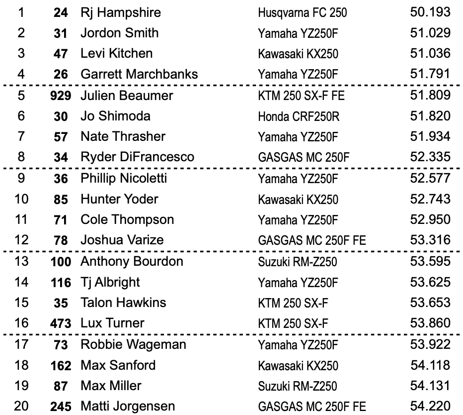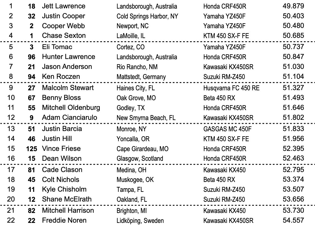 Jett Lawrence, Hampshire en Vialle op pole in Nashville by motocrossplanet20 april 202420 april 2024 De kwalificaties van de AMA Supercross in Nashville zitten erop. Jett Lawrence, RJ Hampshire en Tom Vialle hebben de snelste tijden op de klok weten te zetten. 450 klasse: East Coast Lites: West Coast Lites: