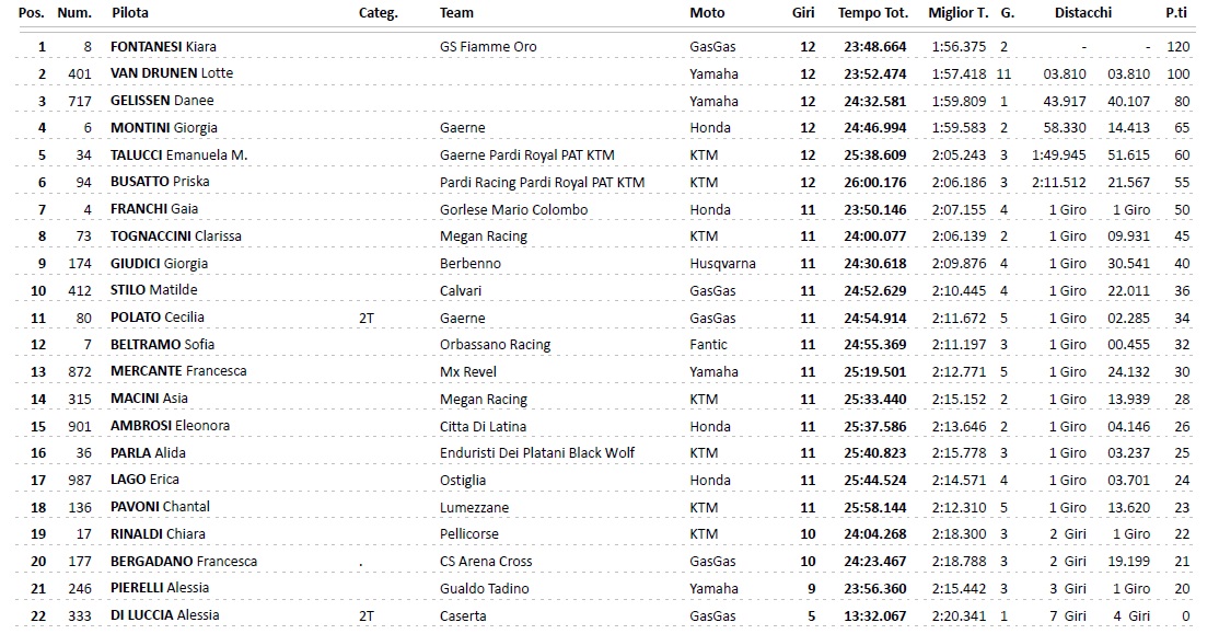 Van Drunen en Gelissen tweede en derde in eerste manche Cingoli by motocrossplanet20 april 202420 april 2024 Lotte van Drunen en Danee Gelissen zijn in de eerste manche van het Italiaans Kampioenschap Dames in Cingoli op een tweede en derde plaats geëindigd. De overwinning ging naar Kiara Fontanesi! Uitslag eerste manche: