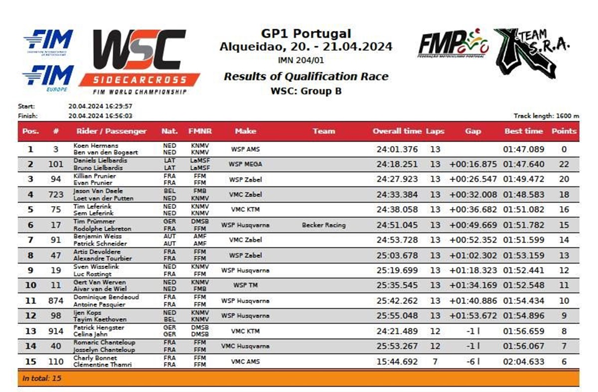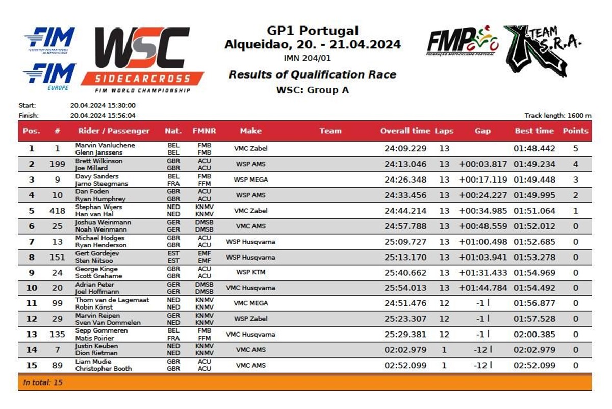De zijspancombinaties van Vanluchene en Hermans hebben vandaag de kwalificatieheats van het WK Zijspancross in Portugal weten te winnen.