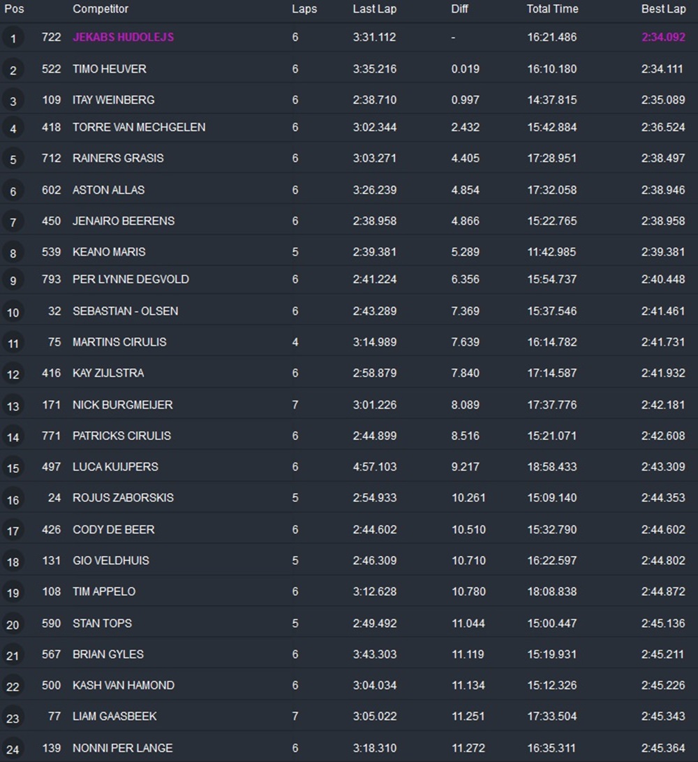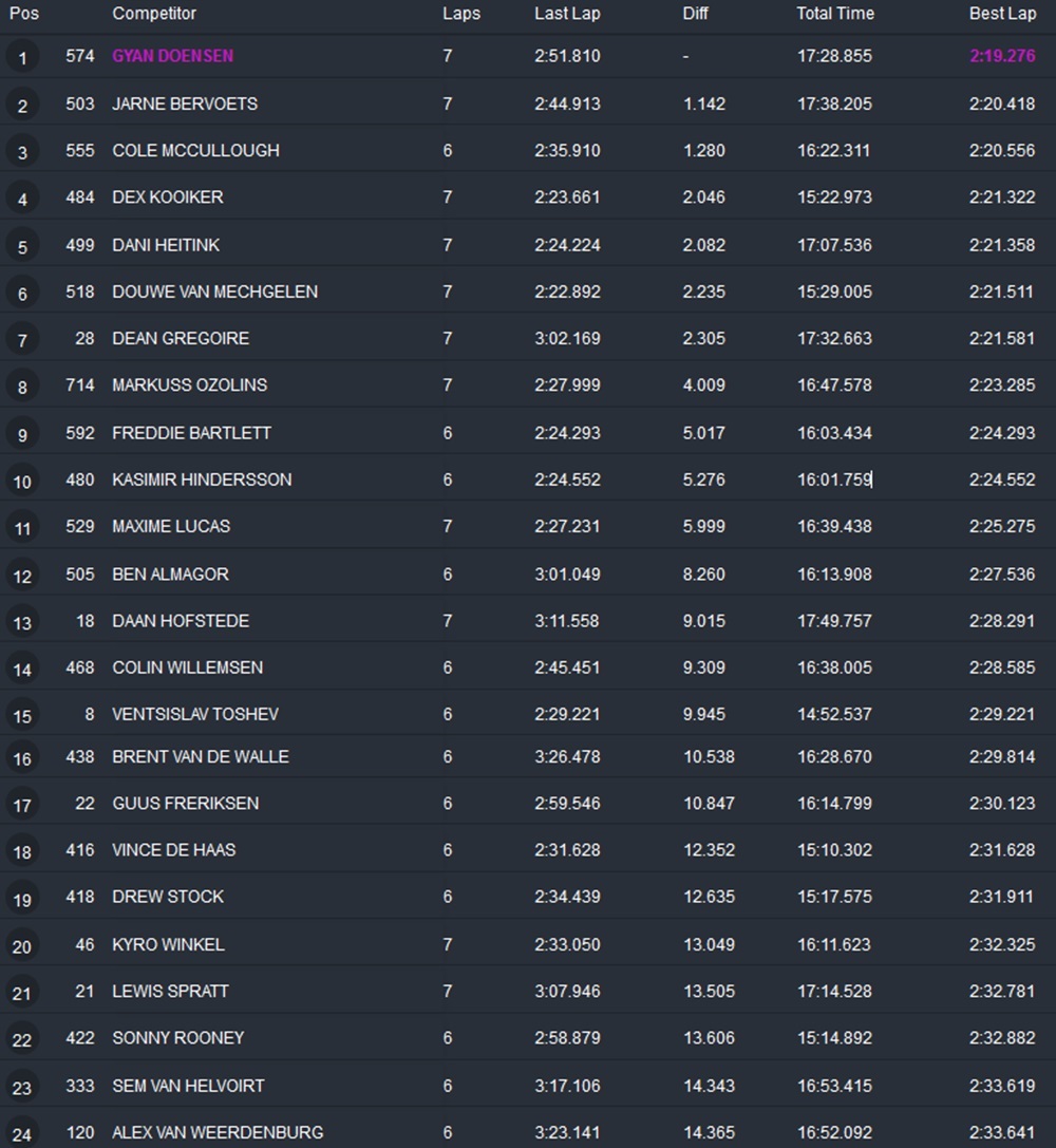 Klik op de volgende link voor complete uitslagen: https://speedhive.mylaps.com/livetiming/FC2DF9159DC2E312-2147483689