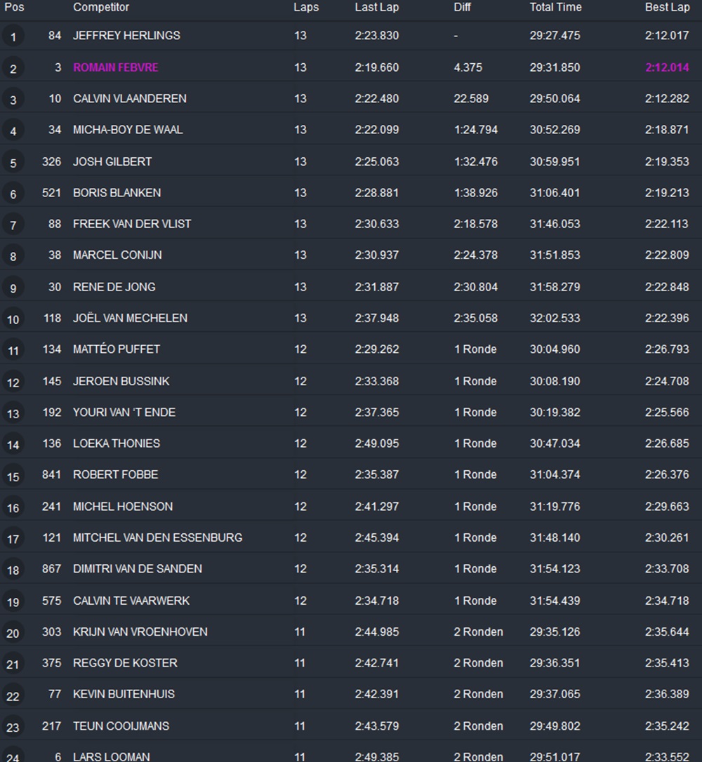Klik op de volgende link voor complete uitslagen: https://speedhive.mylaps.com/livetiming/FC2DF9159DC2E312-2147483689