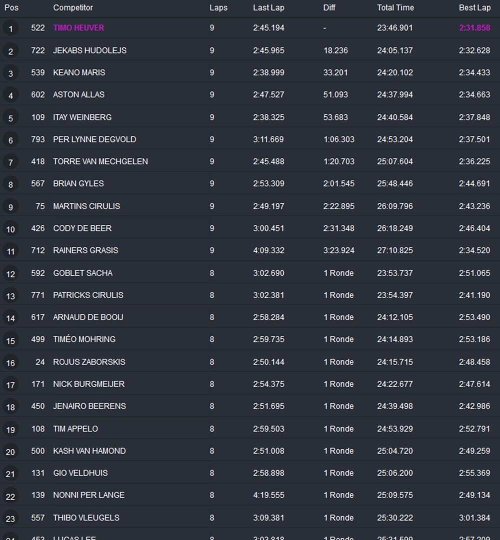Klik op de volgende link voor complete uitslagen: https://speedhive.mylaps.com/livetiming/FC2DF9159DC2E312-2147483689