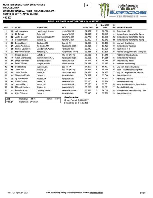 In de 450 klasse wist Jett Lawrence een hele scherpe tijd op de klok te zetten. Hij trainde als snelste voor Eli Tomac en Justin Cooper. Cooper Webb kwam uit op een vierde tijd en Benny Bloss reed zijn Factory Beta naar een vijfde positie.