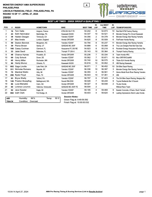 Jett Lawrence en Tom Vialle hebben in de eerste tijdtraining van de AMA Supercross in Philadelphia de snelste tijd op de klok weten te zetten.