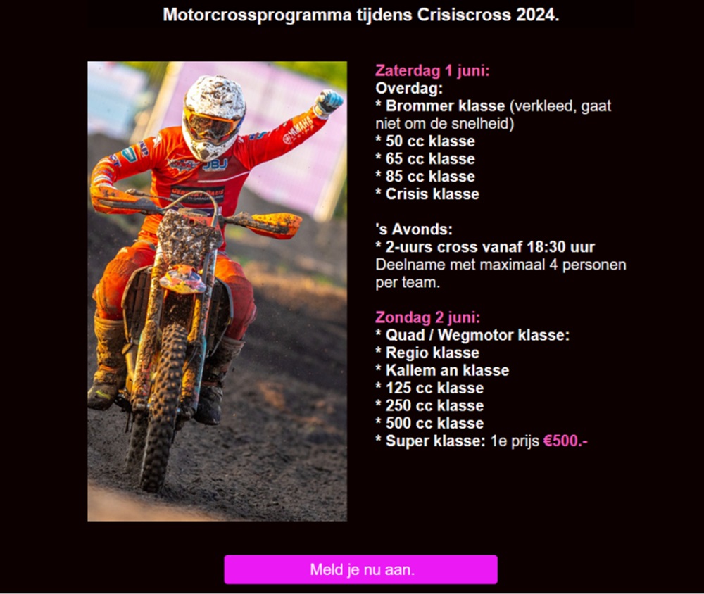 Het festival biedt ook dit jaar weer aan motorcrossers van alle niveaus een deelname-mogelijkheid. Doe alleen mee in één van de solo-klasses. In de Superklasse doet de organisatie dit jaar een schepje bovenop het prijzengeld.