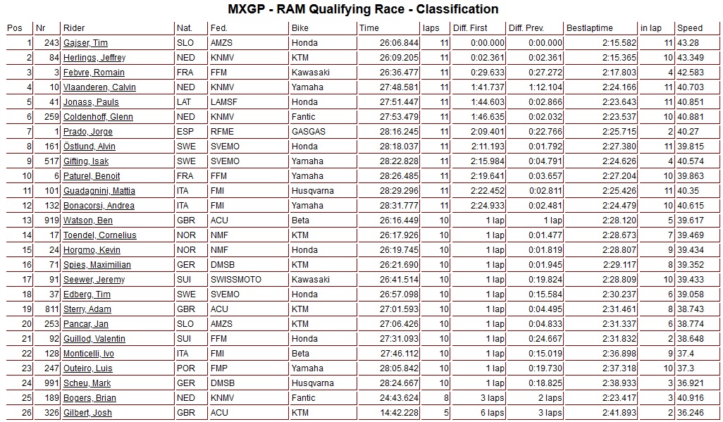 De overwinning ging naar Tim Gajser en Romain Febvre kwam op een derde plaats over de finish. Calvin Vlaanderen kwam op een goede vierde plaats over de finish voor Pauls Jonass. Glenn Coldenhoff reed op een vijfde plaats toen hij ten val kwam. Hierbij ging veel tijd verloren maar Coldenhoff kwam nog goed terug naar een zesde plaats. WK leider Jorge Prado had het moeilijk. Hij startte in de kopgroep maar viel terug naar een zevende plaats.