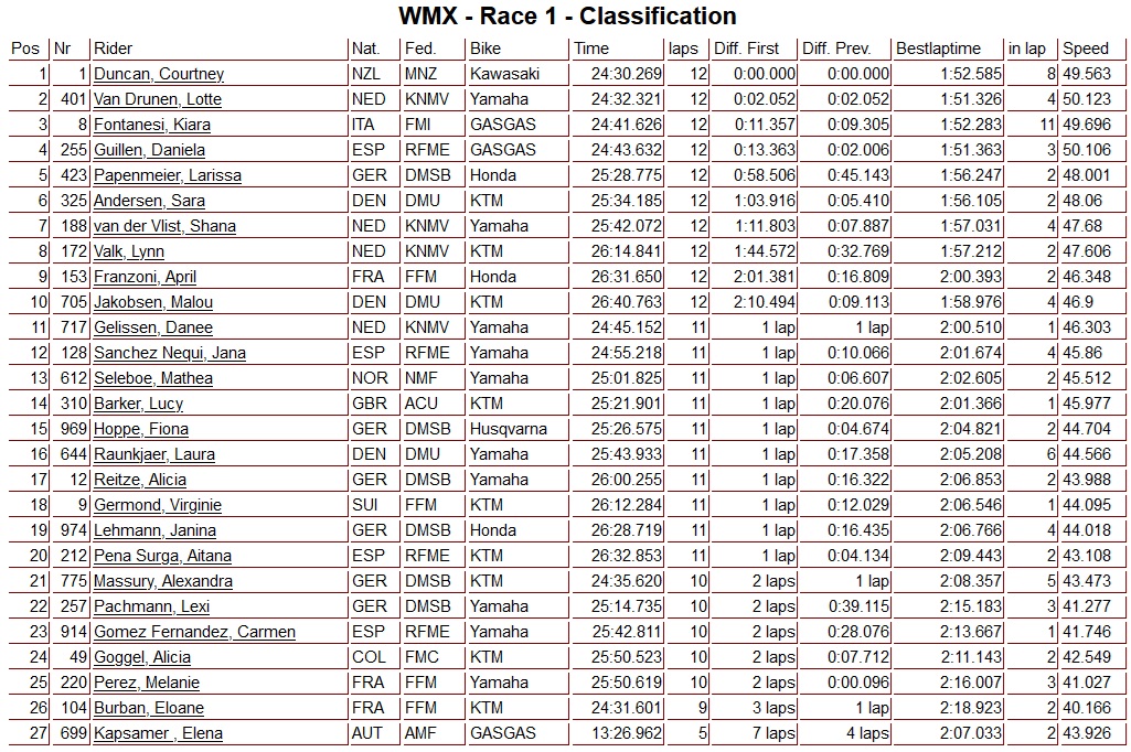Courtney Duncan van F&H Racing heeft de eerste manche van de WMX in Spanje weten te winnen. Duncan nam kopstart en leidde van start tot finish. Lotte van Drunen werkte zich op naar een tweede plaats en zette Duncan volop onder druk. Duncan hield het hoofd koel tot aan de finish en won voor van Drunen en Kiara Fontanesi. Daniela Guillen bemoeide zich ook met het gevecht in de kopgroep maar kwam ten val en finishte als vierde.