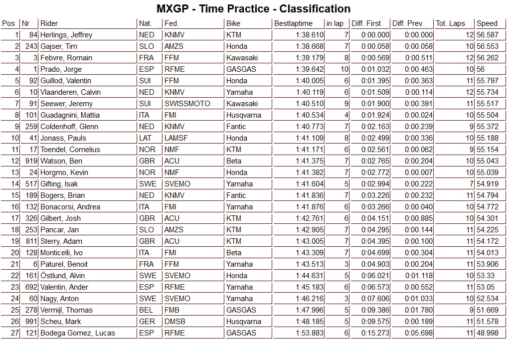Jeffrey Herlings heeft in de tijdtraining van de MXGP klasse in Spanje de snelste tijd op de klok weten te zetten. Herlings was een fractie sneller dan Tim Gajser en Romain Febvre. Jorge Prado en Valentin Guillod waren vierde en vijfde. Calvin Vlaanderen kwam uit op een zesde tijd en Glenn Coldenhoff sloot de sessie af als negende. Brian Bogers mag in de kwalificatieheat als vijftiende naar het starthek!