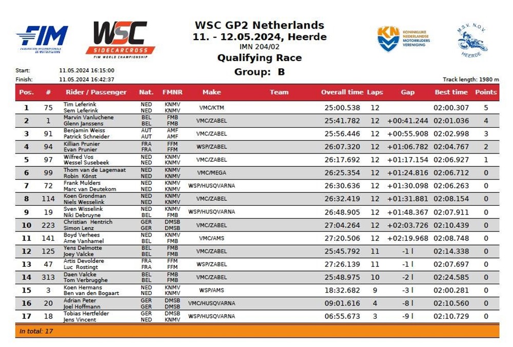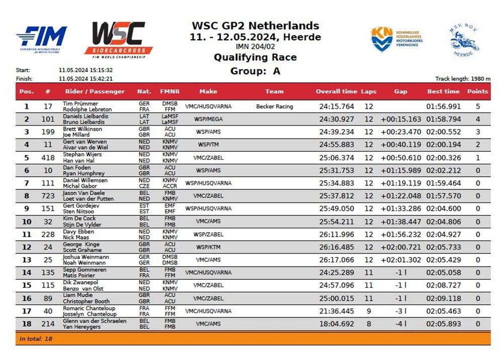 De kwalificatieheats van de Grand Prix Zijspancross in Heerde is gewonnen door Prummer en Leferink. Prummer won de eerste heat voor Lielbardis en Wilkinson.