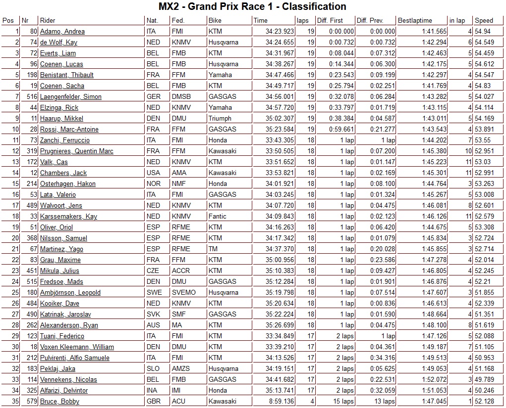 Andrea Adamo heeft de spannende eerste manche van de MX2 klasse in Galicia weten te winnen. Adamo nam kopstart en leidde van start tot finish. In de beginfase stond hij flink onder druk van Thibault Benistant en later van Kay de Wolf. De Nederlander gaf alles om de manche te winnen maar kwam net tekort en werd tweede voor Liam Everts en Lucas Coenen. Benistant kwam in de voorlaatste ronde ten val en moest daardoor genoegen nemen met een vijfde plaats.