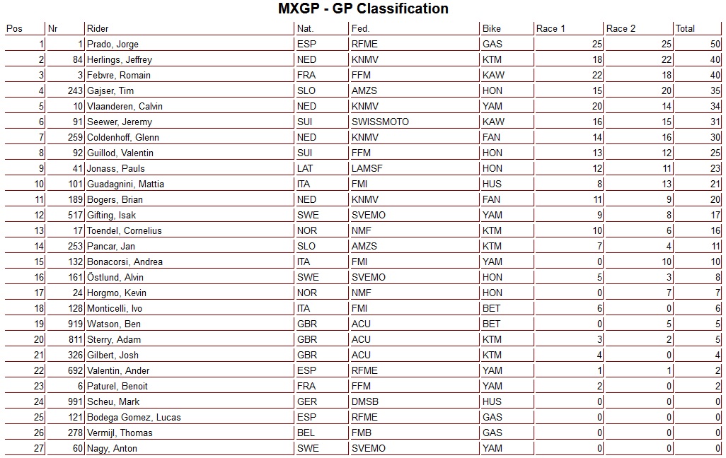 Prado wint in Galicia voor Herlings by motocrossplanet12 mei 202412 mei 2024 Jorge Prado heeft zijn thuis Grand Prix in Spanje gewonnen voor Jeffrey Herlings en Romain Febvre! Bekijk de uitslagen hieronder: Bekijk de MX Vice Show met Tim Gajser en Giacomo Gariboldi