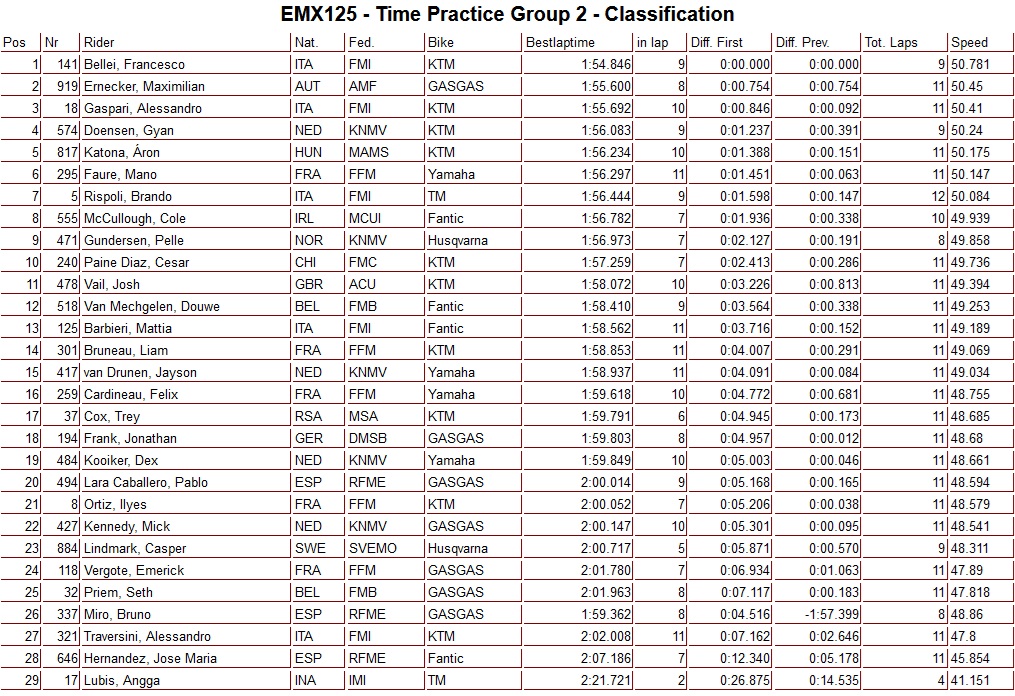 Francesco Bellei heeft in de tweede groep van de EMX125 klasse in Frankrijk de snelste tijd neer weten te zetten. Max Ernecker was lange tijd het snelste maar in de slotfase wist Bellei zijn tijd te verbeteren. Alessandro Gaspari trainde als derde voor Gyan Doensen en Aron Katona.