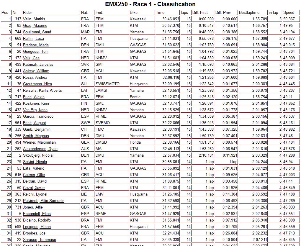 Mathis Valin heeft de eerste manche van het EMX250 Kampioenschap in Frankrijk weten te winnen. In de regen wist hij de manche te winnen voor Maxime Grau en Saad Soulimani. Luca Ruffini en Mads Fredsoe maakten de top vijf compleet.