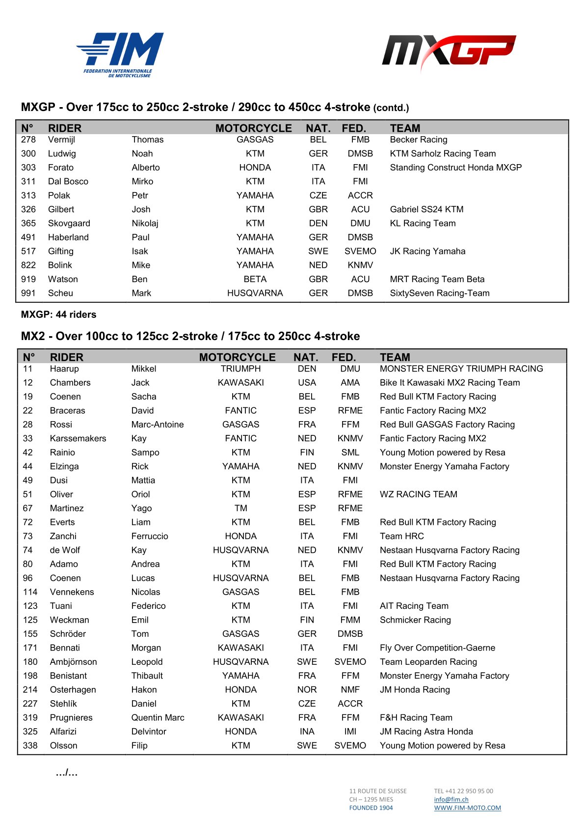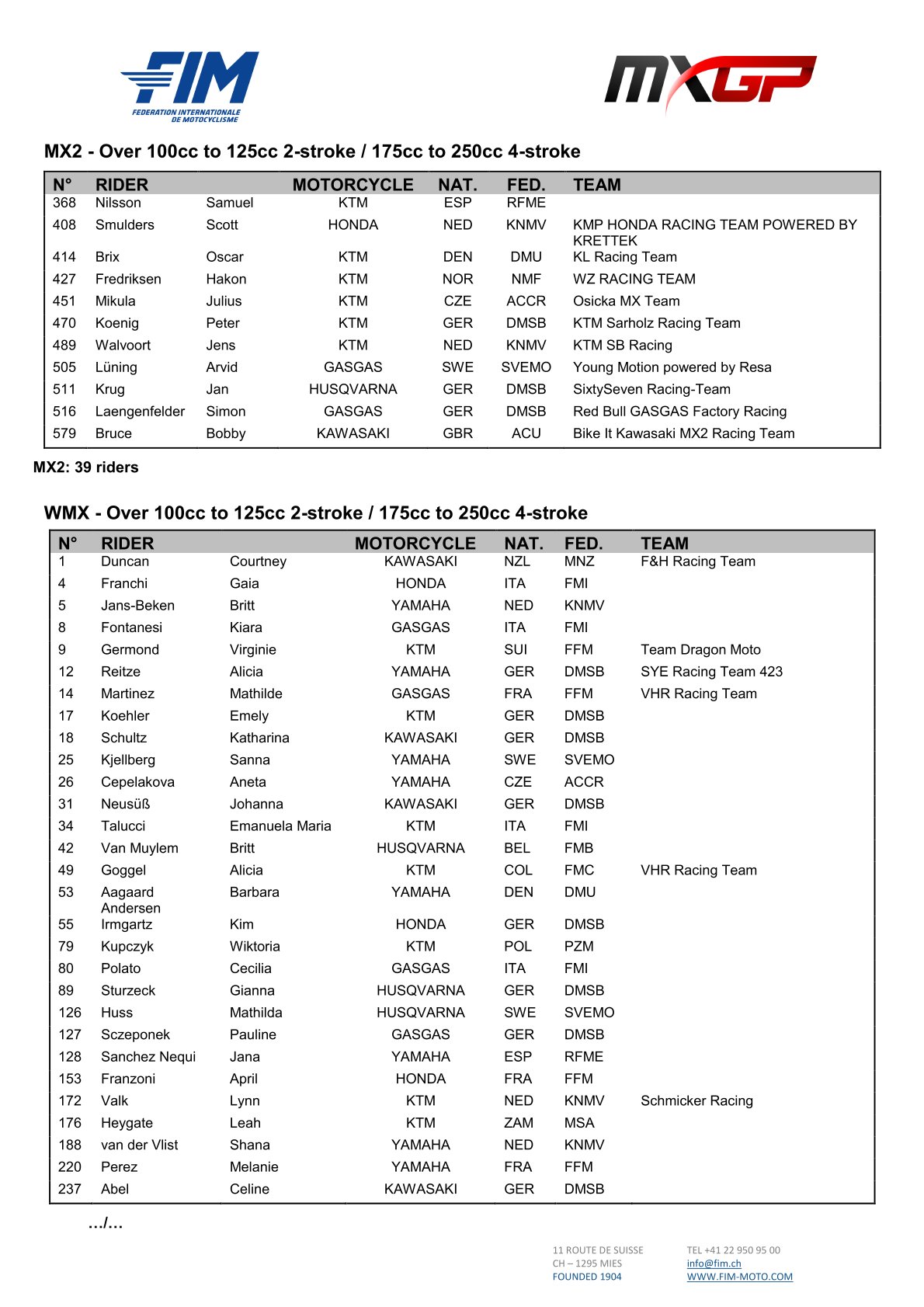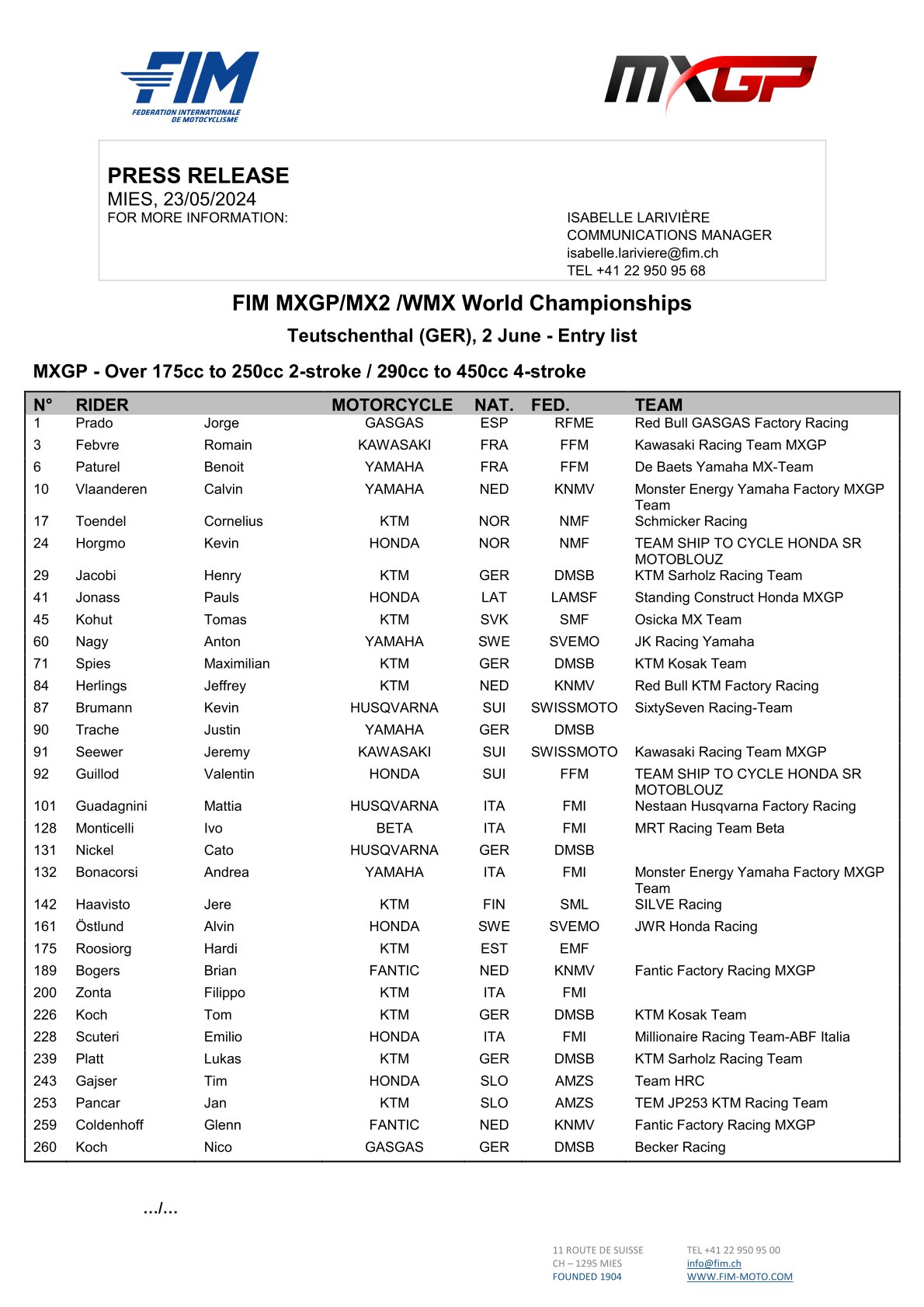 MXGP Duitsland – Deelnemerslijst by motocrossplanet23 mei 2024 In het weekend van 1 en 2 juni wordt de achtste wedstrijd van het wereldkampioenschap MXGP/MX2 en WMX verreden in het Duitse Teutschenthal. De FIM heeft vanochtend de deelnemerslijsten vrijgegeven voor het evenement.