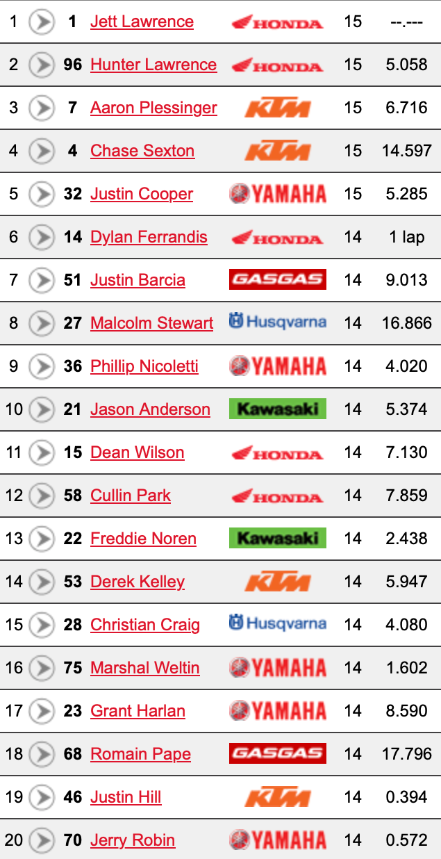 Jett Lawrence heeft de eerste manche van de 450 klasse op Fox Raceway gedomineerd. Lawrence nam kopstart en leidde van start tot finish. Achter hem streden Aaron Plessinger en Hunter Lawrence om de tweede plaats. Plessinger hield het lang vol maar in het tweede deel van de wedstrijd wist Hunter hem te passeren en werd tweede voor Plessinger.