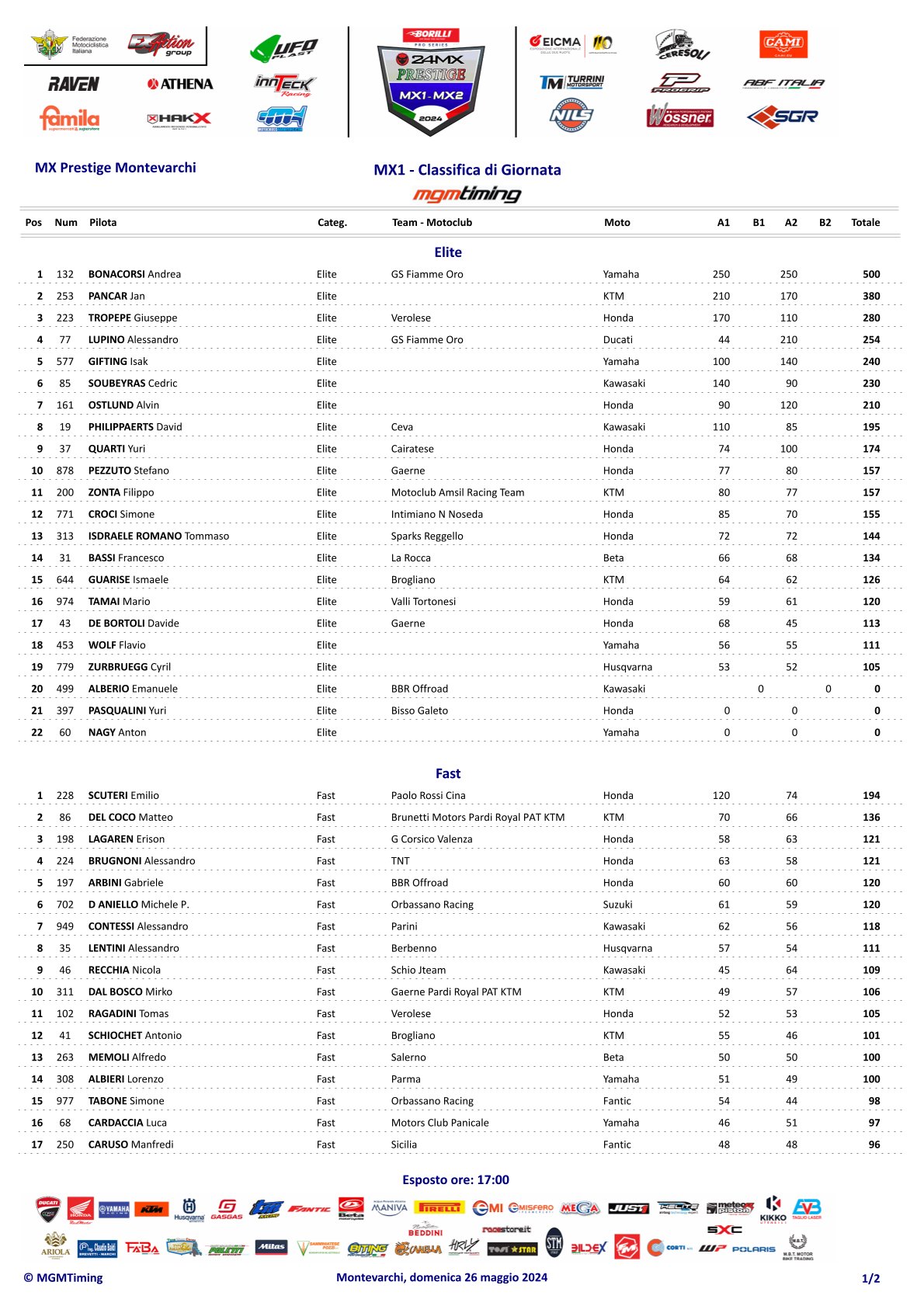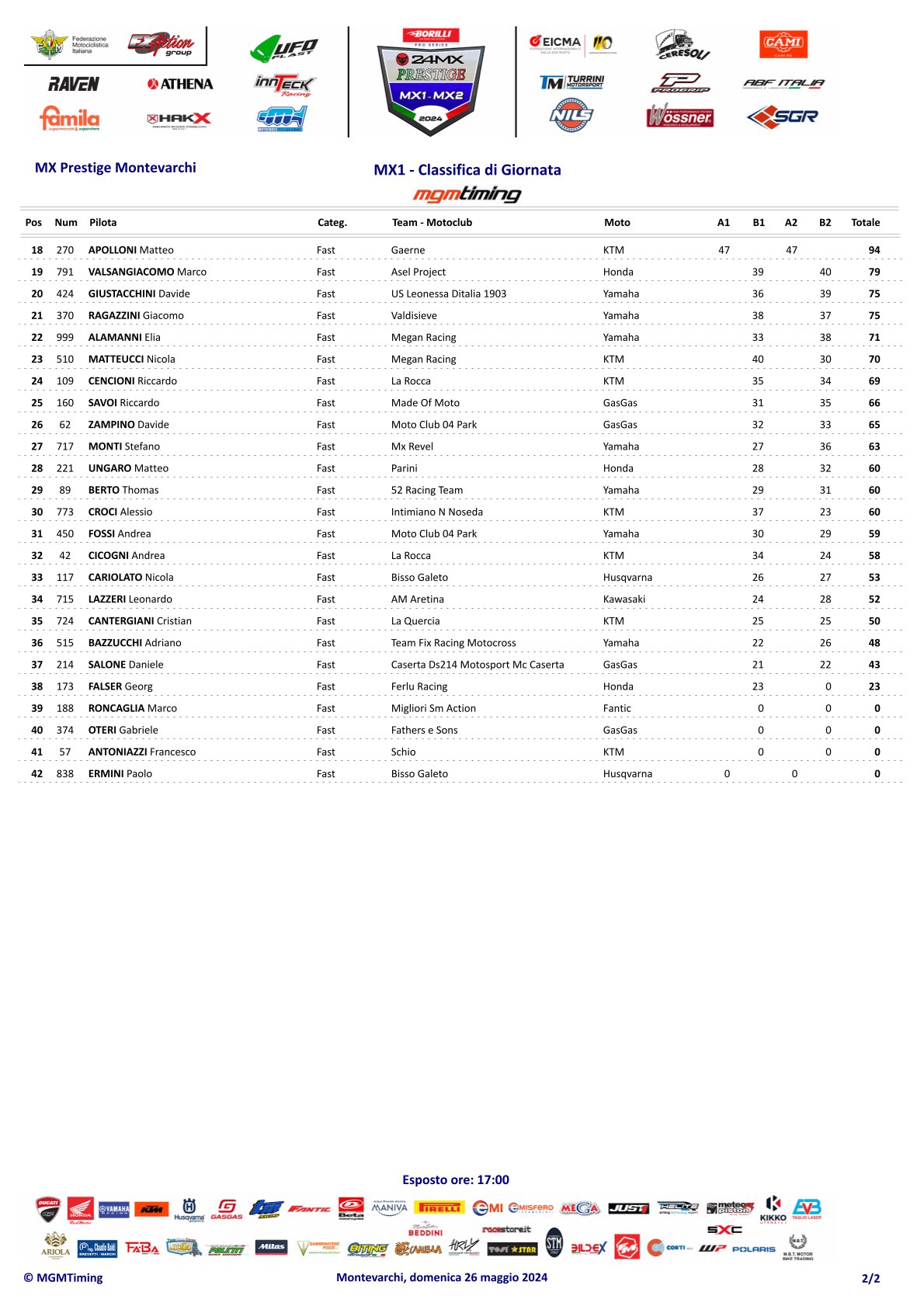 In de MX1 klasse won Andrea Bonacorsi beide manches en pakte de dagzege voor Jan Pancar 2-3 en Giuseppe Tropepe 3-6.