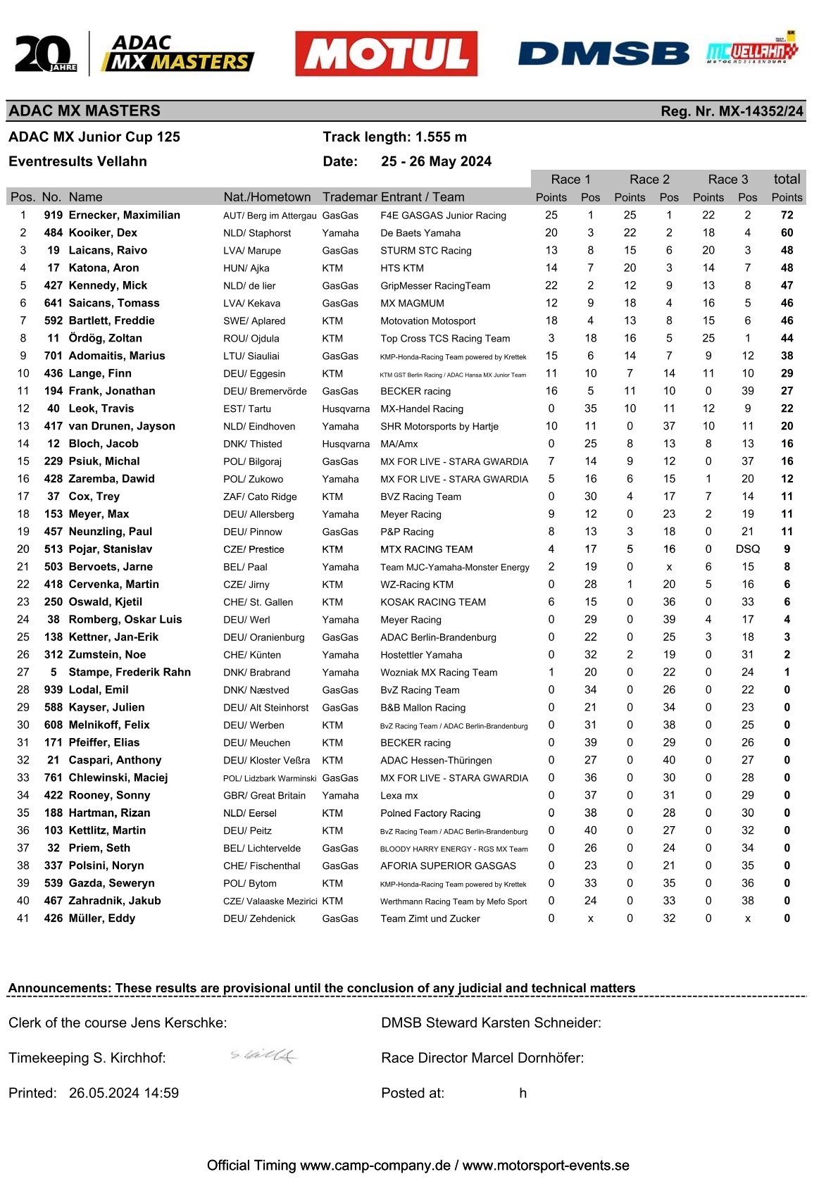 Naast Kooiker wist ook Mick Kennedy in de top vijf te eindigen (2-9-8). Jayson van Drunen werd dertiende (11-37-11). Jarne Bervoets werd eenentwintigste (19-DNF-15) en Rizan Hartman legde beslag op een vijfendertigste plaats (38-28-30).