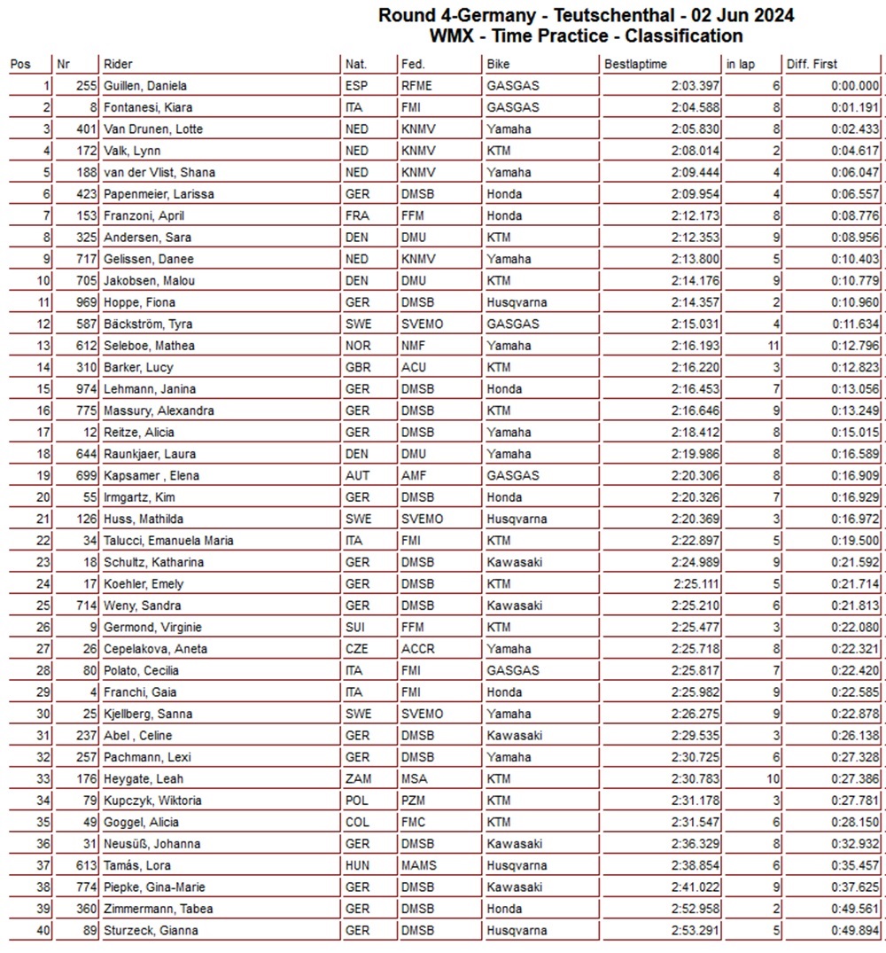 Daniela Guillen heeft in de tijdtraining van de dames in Duitsland de snelste tijd neer weten te zetten. Achter haar was het Kiara Fontanesi die als tweede trainde voor Lotte van Drunen. Lynn Valk en Shana van der Vlist waren vierde en vijfde en Danee Gelissen kwam uit op een negende tijd.