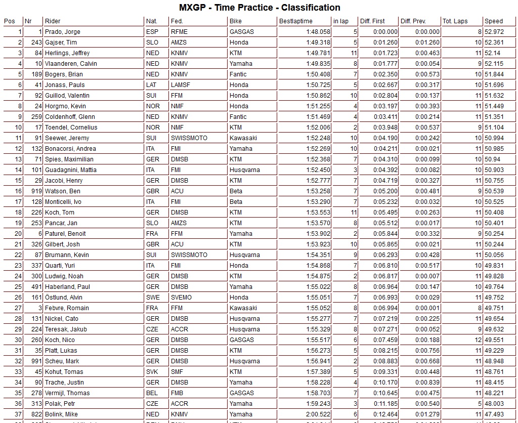 Jorge Prado heeft in de tijdtraining van de MXGP klasse in Duitsland de snelste tijd neer weten te zetten voor Jorge Prado en Jeffrey Herlings. Calvin Vlaanderen en Brian Bogers wisten een goede vierde en vijfde tijd neer te zetten. Ook Glenn Coldenhoff zat met een negende tijd in de top tien. Thomas Vermijl klokte een vijfendertigste tijd en Mike Bolink sloot de sessie af als zevenentwintigste.
